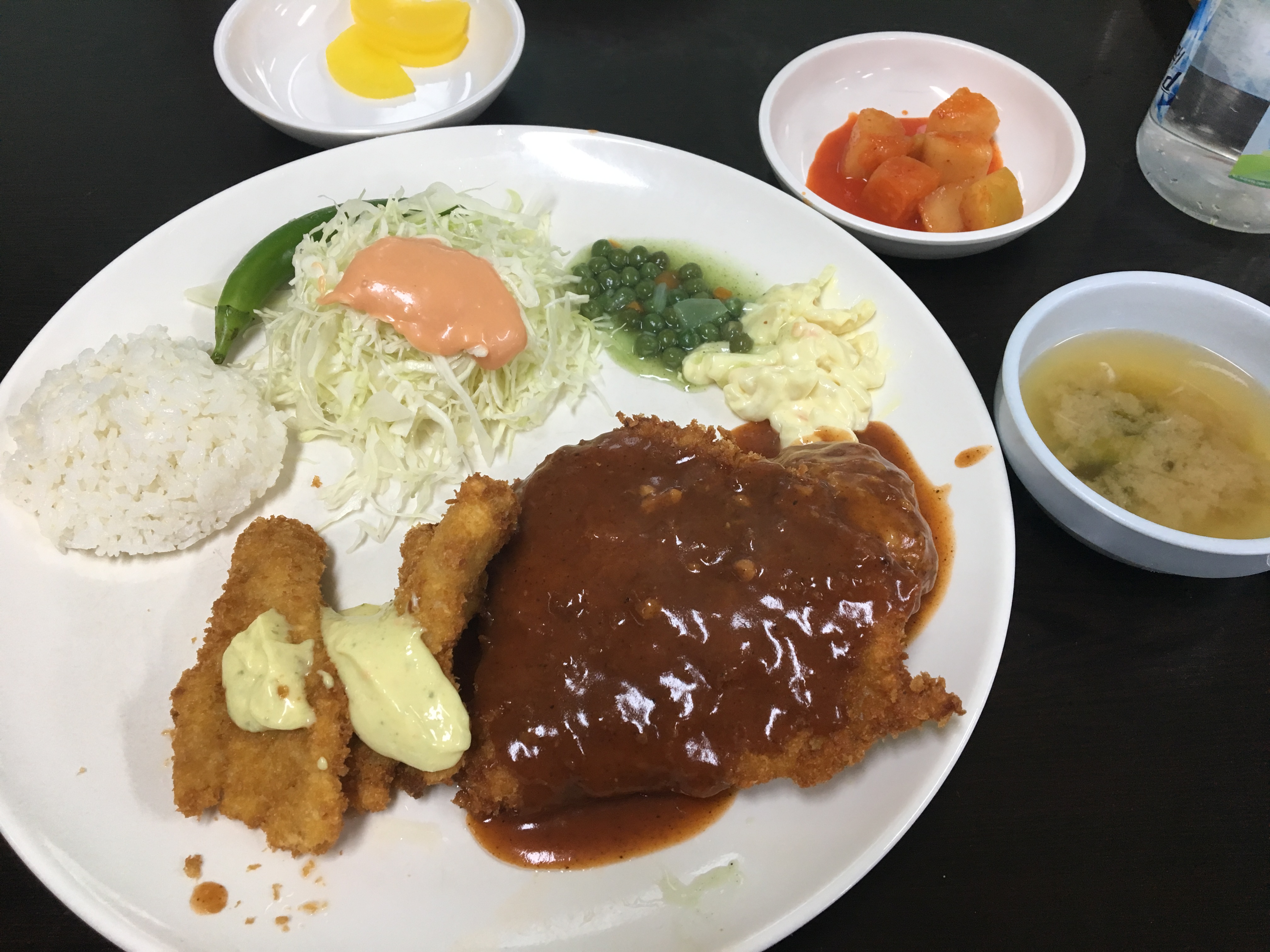 단박왕돈까스에서돈까스하고 생선까스 함박이 들어있는 정식으로 시켰습니다.