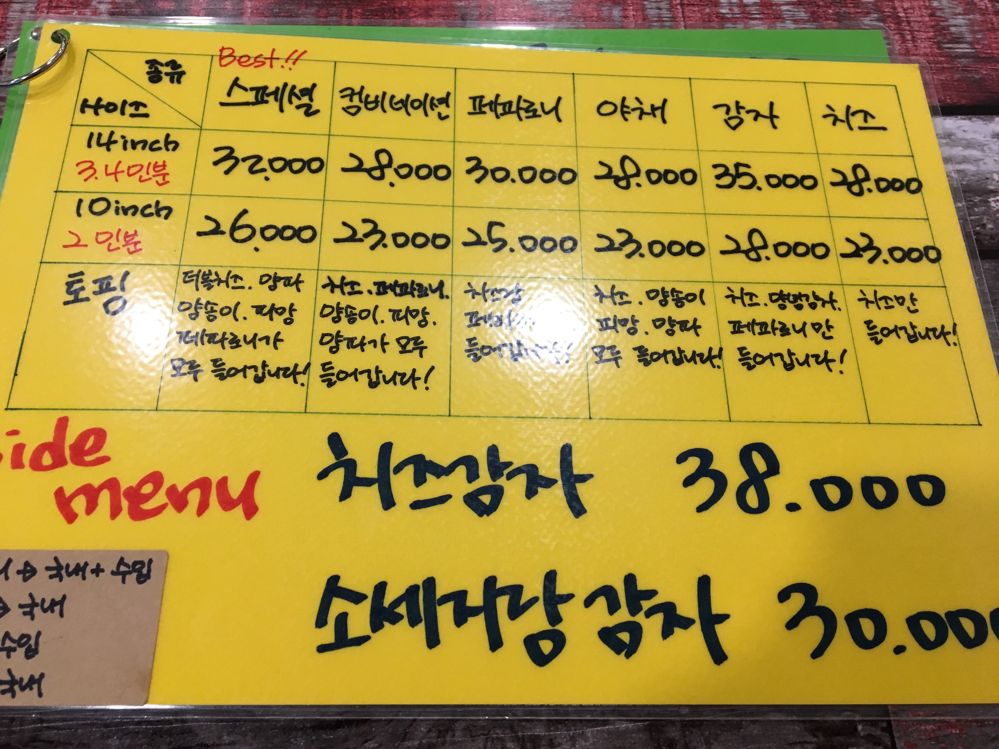 피자 아일랜드 메뉴판인데요. 동네 피자가게 치곤 가격은 비싼 편입니다.