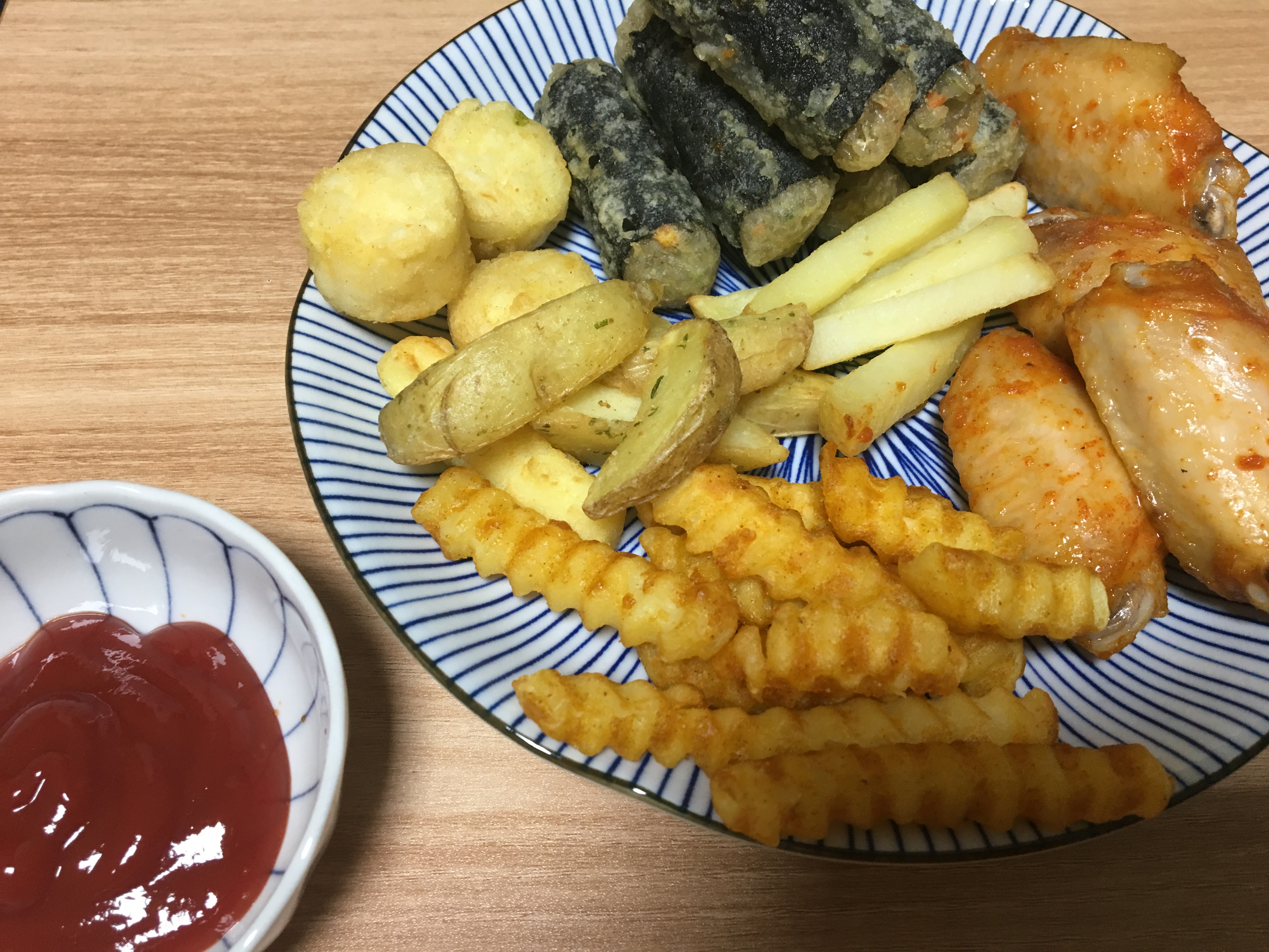 에어프라이어에서 돌린 5가지 감자튀기과 김말이 그리고 와이프가 좋아하는 닭날개 입니다.