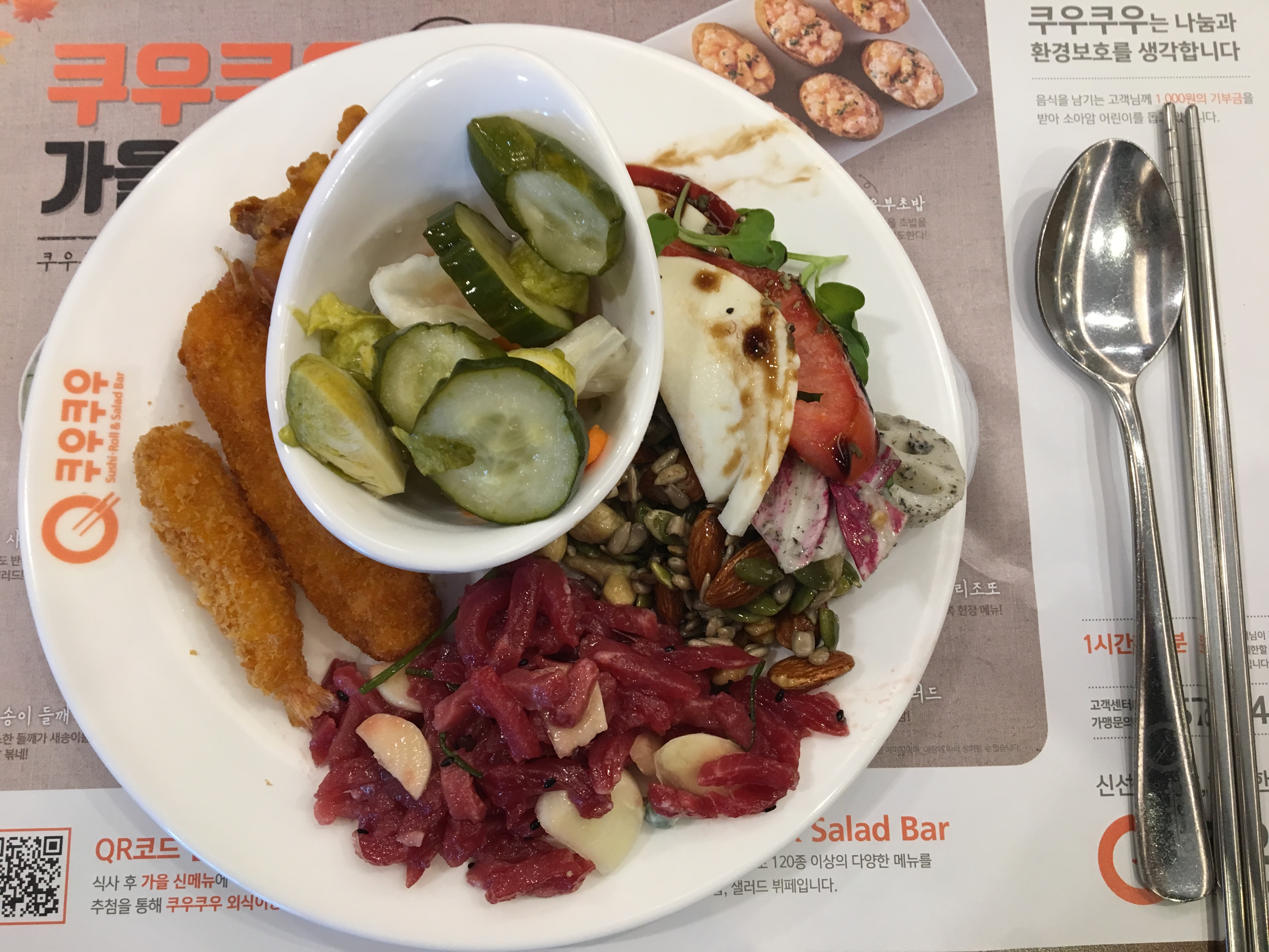 쿠우쿠우에서 뭘 먹을까 보다가 피클도 챙겨오고 육회가 준비되어 있었는데요.