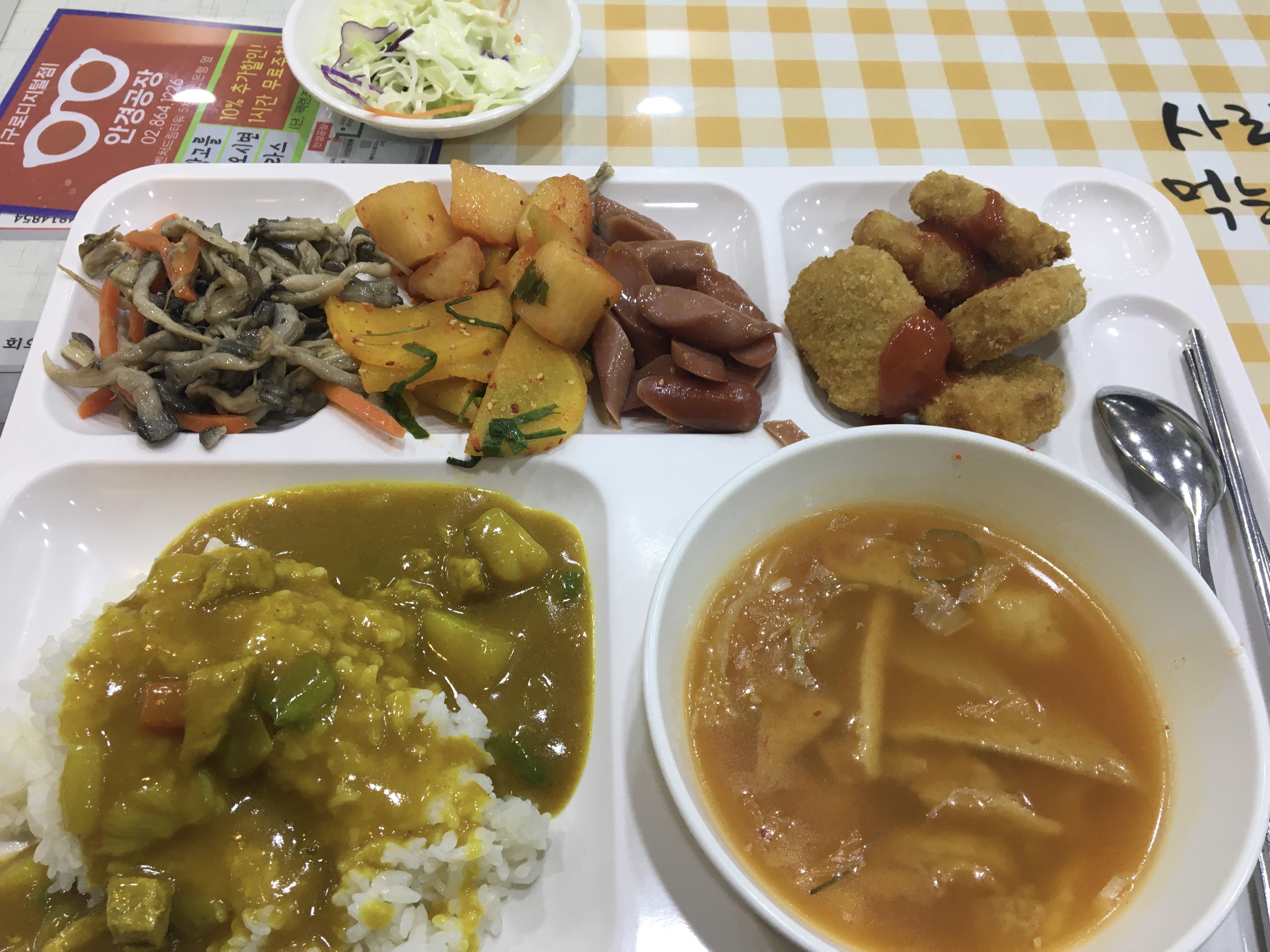 전날 집에서 카레 만들어 먹었는데 또 카레라니 ... 이 날 반찬은 돈까스와 햄 깍두기와 단무지 그리고 버섯볶음에 오뎅국이였는데요.
