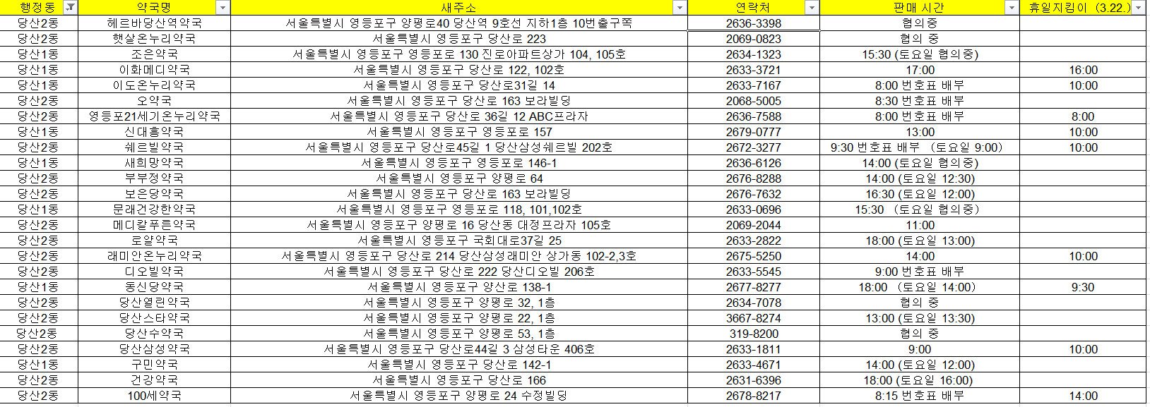 서울특별시 영등포구 당산1동, 당산2동에서 공적마스크 판매 약국의 주소, 연락처, 판매시간