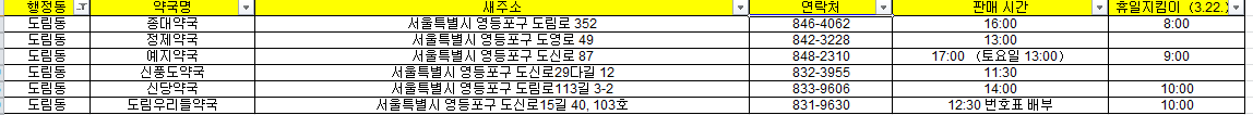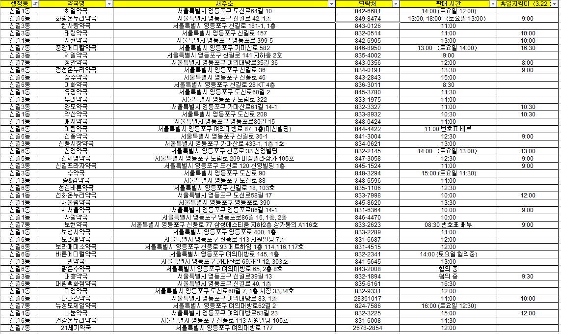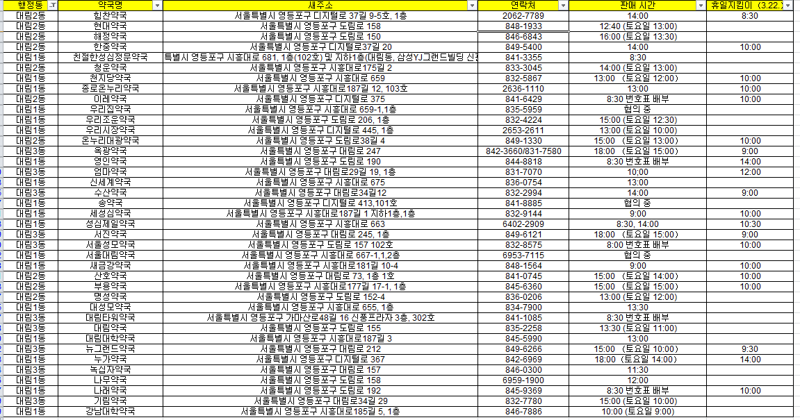 서울특별시 영등포구 대림1동, 대림2동, 대림3동 에서 공적마스크 판매 약국의 주소, 연락처, 판매시간