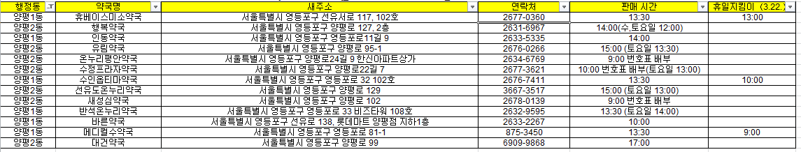 서울특별시 영등포구 양평1동, 양평2동 에서 공적마스크 판매 약국의 주소, 연락처, 판매시간