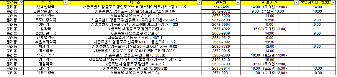 서울특별시 영등포구 문래동 에서 공적마스크 판매 약국의 주소, 연락처, 판매시간