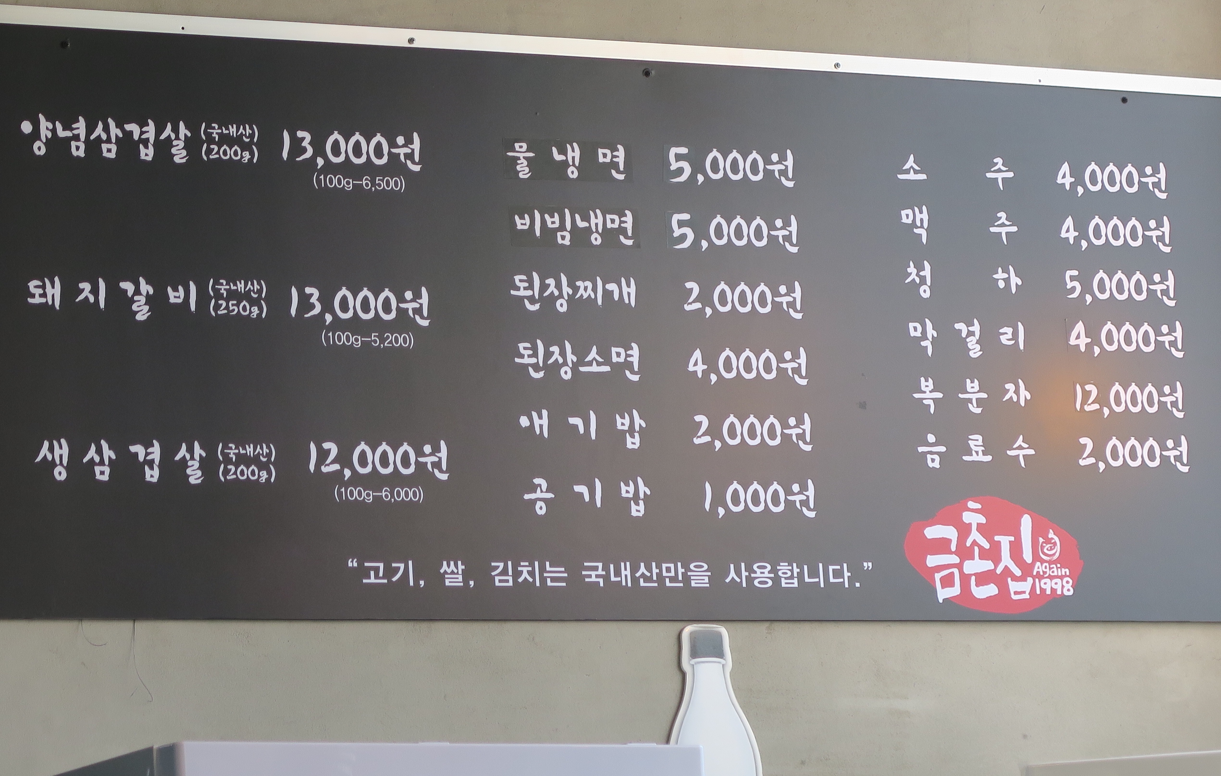 후평동 삼겹살 맛집 금촌집의 메뉴와 가격입니다.