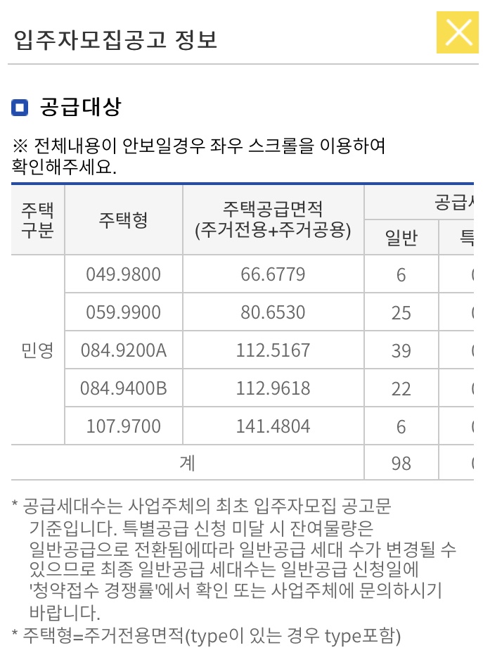 4. 85타입 이하는 100% 가점제 , 85타입 초과는 가점/추첨 비율이 50:50 (추첨대상: 무주택인데 가점탈락자+1주택처분)