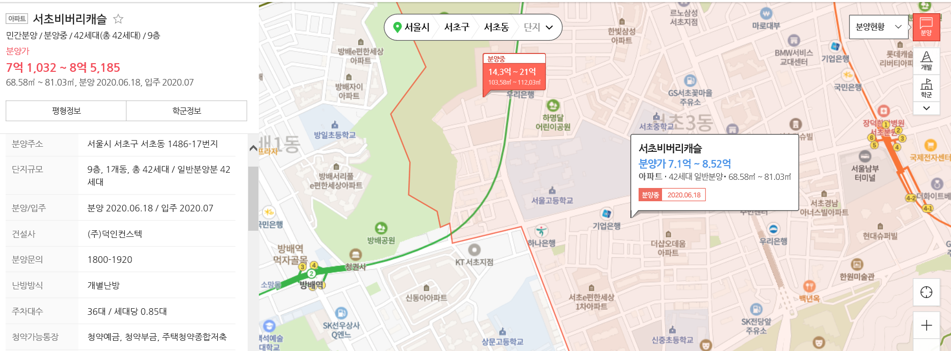 - 장점 : 강남의 아파트, 9억이하의 분양가 , 학군 좋음( 신중초등학교,서초중학교,서울고등학교 등이 있음), 우면산공원, 남부터미널, 예술의 전당이 근처에 있음.