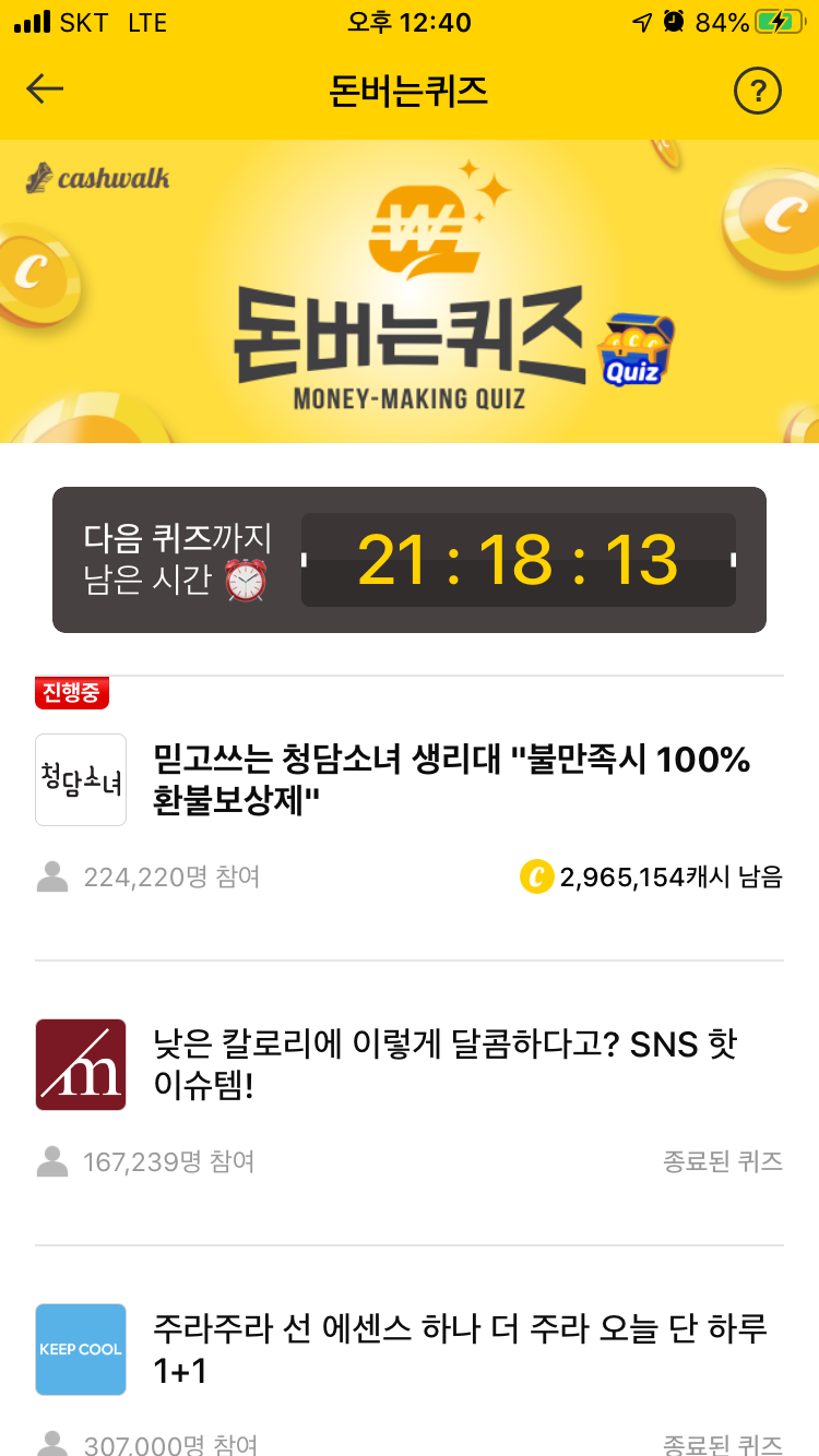 오늘 6월 29일 캐시워크 돈버는퀴즈 청담소녀, 퍼밀초당옥수수 정답