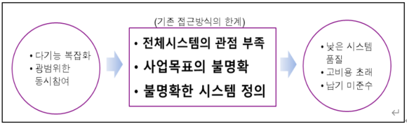 - 최근 IT융합 시스템개발의 증가 및 복합기술 적용으로 기술적 위험성이 증가하고 있으며, 기존개발방식으로는 해결이 어렵거나, 접근방식의 한계로 시스템 공학적 접근이 다양한 분야에서 요구되고 있음.