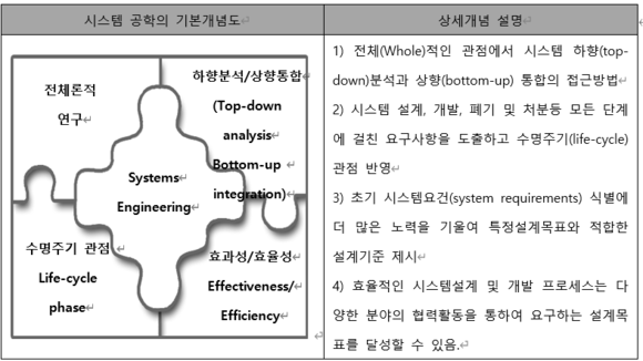 - 고객요구(customer needs)를 충족시키기 위하여 통합되고 수명주기적으로 균형된 시스템 제품과 프로세스, 솔루션을 개발하고 검증하기 위한 다분야 학문간의 상호 연관된 접근 방법.