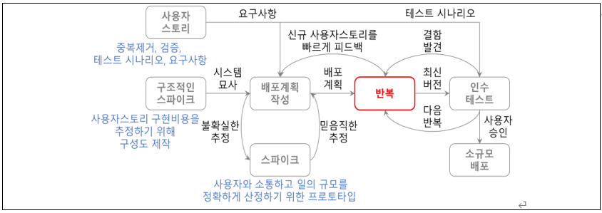- 1~3주의 기간으로 반복을 정의하고, 프로젝트 전반에 대해 균형적으로 유지 - 프로세스의 평가와 계획을 단순하고 신뢰하게 하는 핵심 항목 - 즉각적인 계획 및 실행은 요구사항변경에 쉽게 대처하기 위한 전략 |