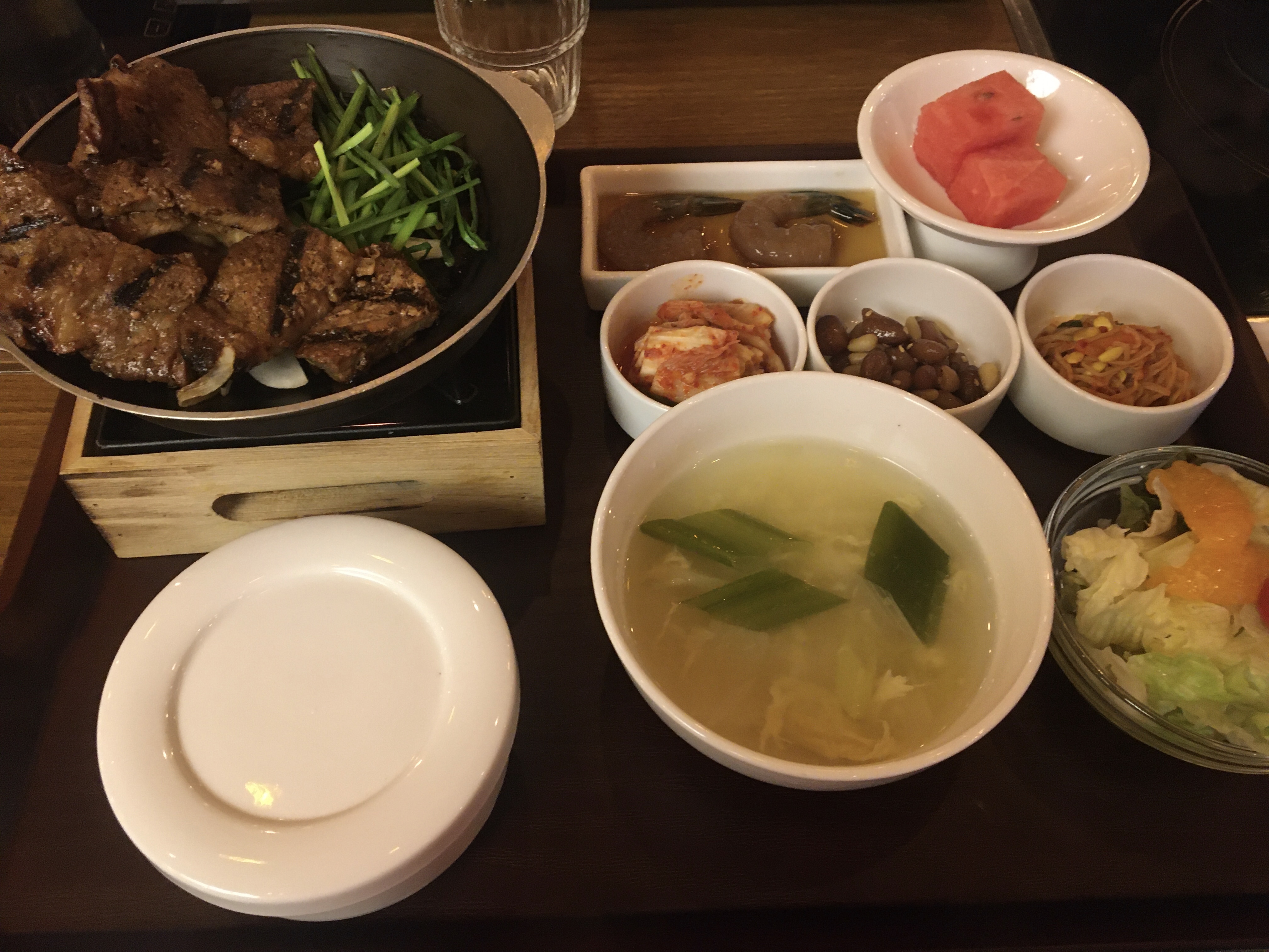 광화문 석갈비의 반찬은 바뀌는 듯한데요. 저는 김치, 견과류, 콩나물, 샐러드, 새우장 그리고 따뜻한 국물과 후식으로 수박과 음료가 나왔습니다.