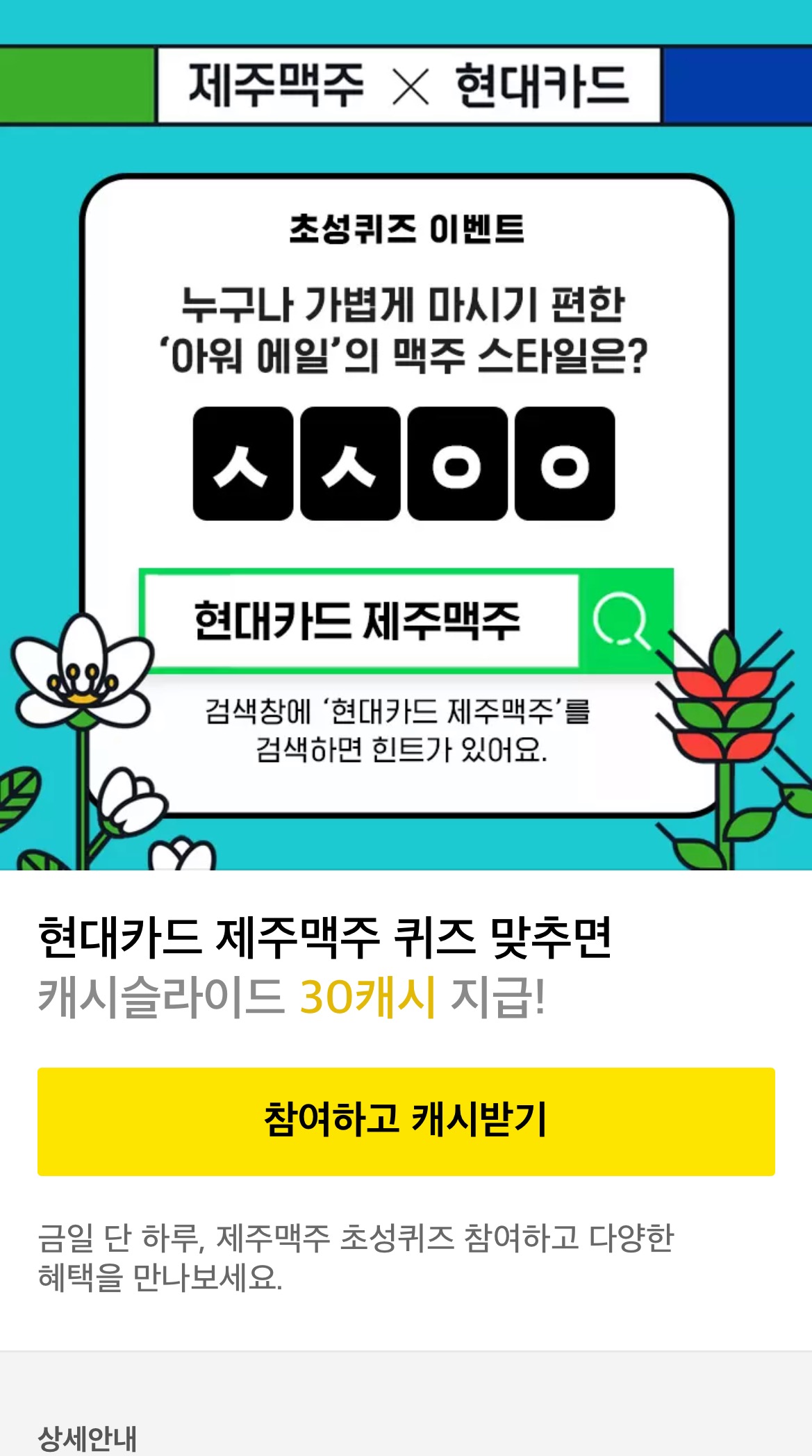 캐시슬라이드 초성퀴즈 이벤트 제주맥주 현대카드