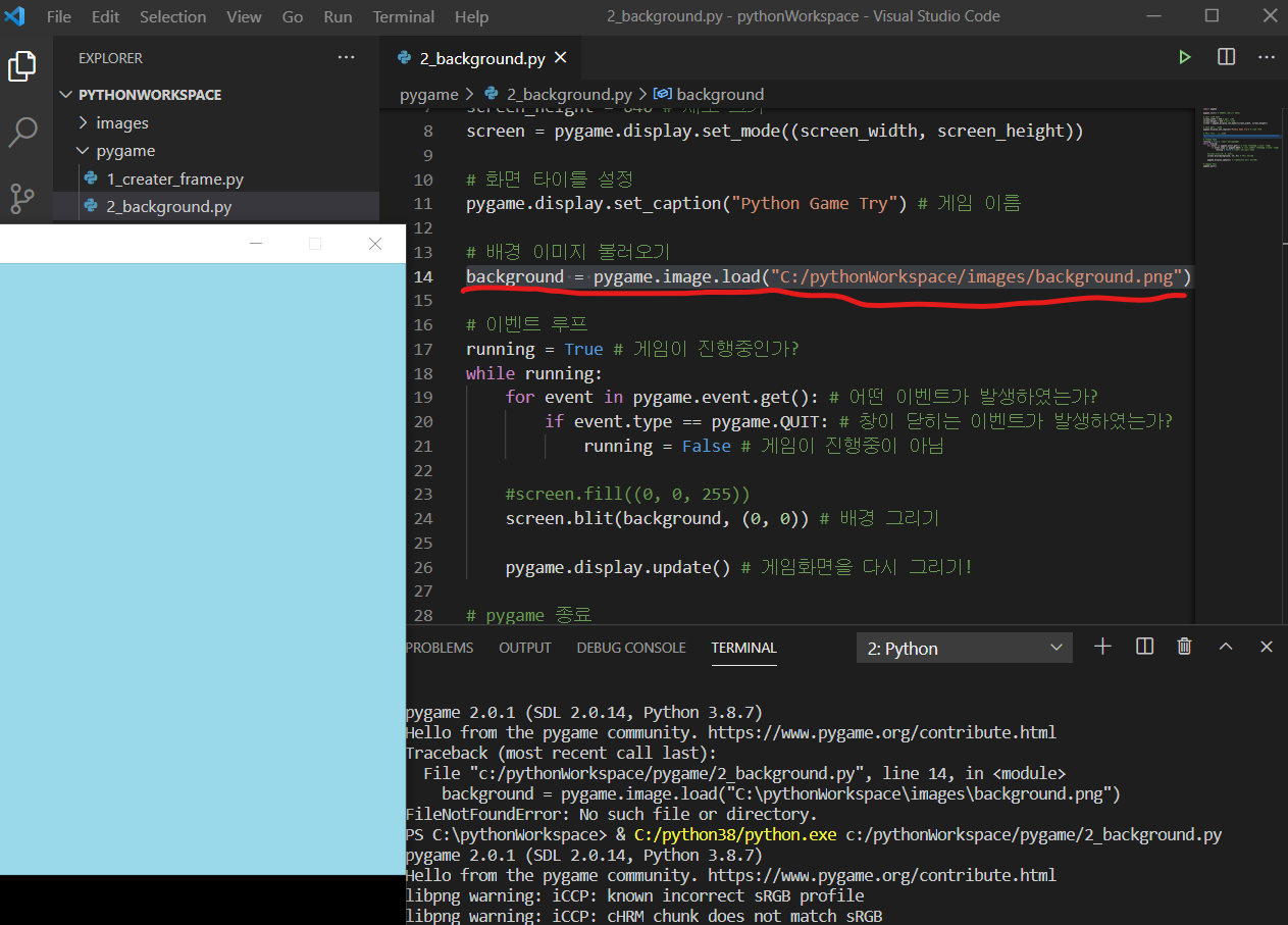 소스를 붙여넣고 에러가 나는 pygame.init() 해결하기 위해서
