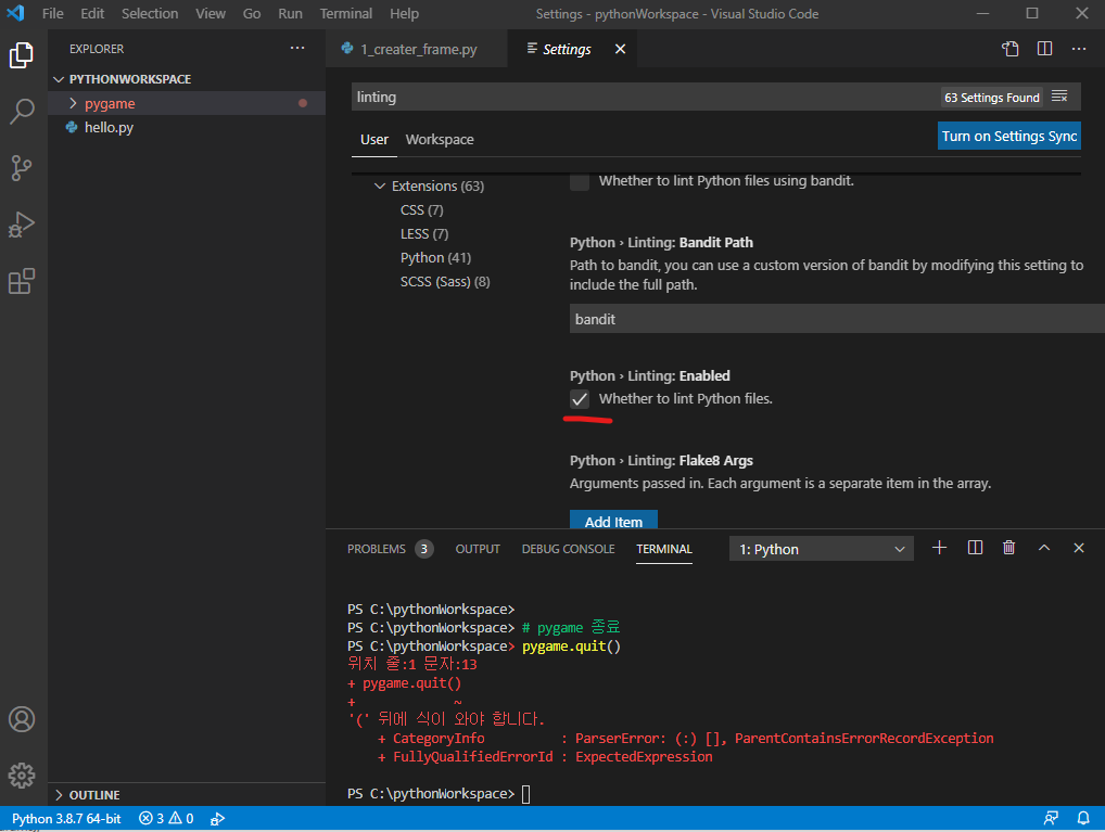 검색창에 linting 을 입력해서 체크된 경우 체크 해제를 합니다.