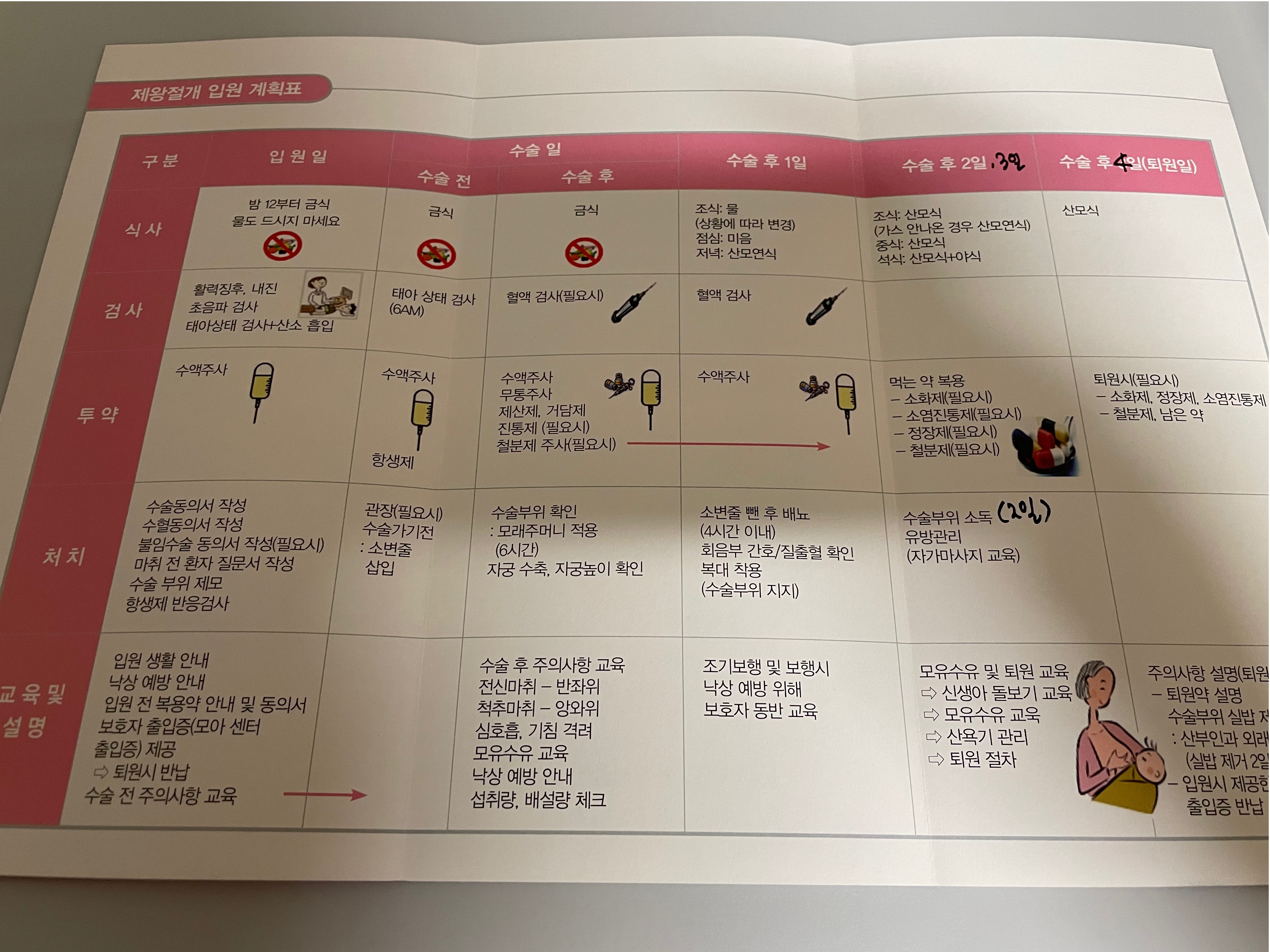 그리고 제왕절개관련 스케줄에 대해서 자세히 나와있어서 어떻게 진행되는지 참고하시면 됩니다.