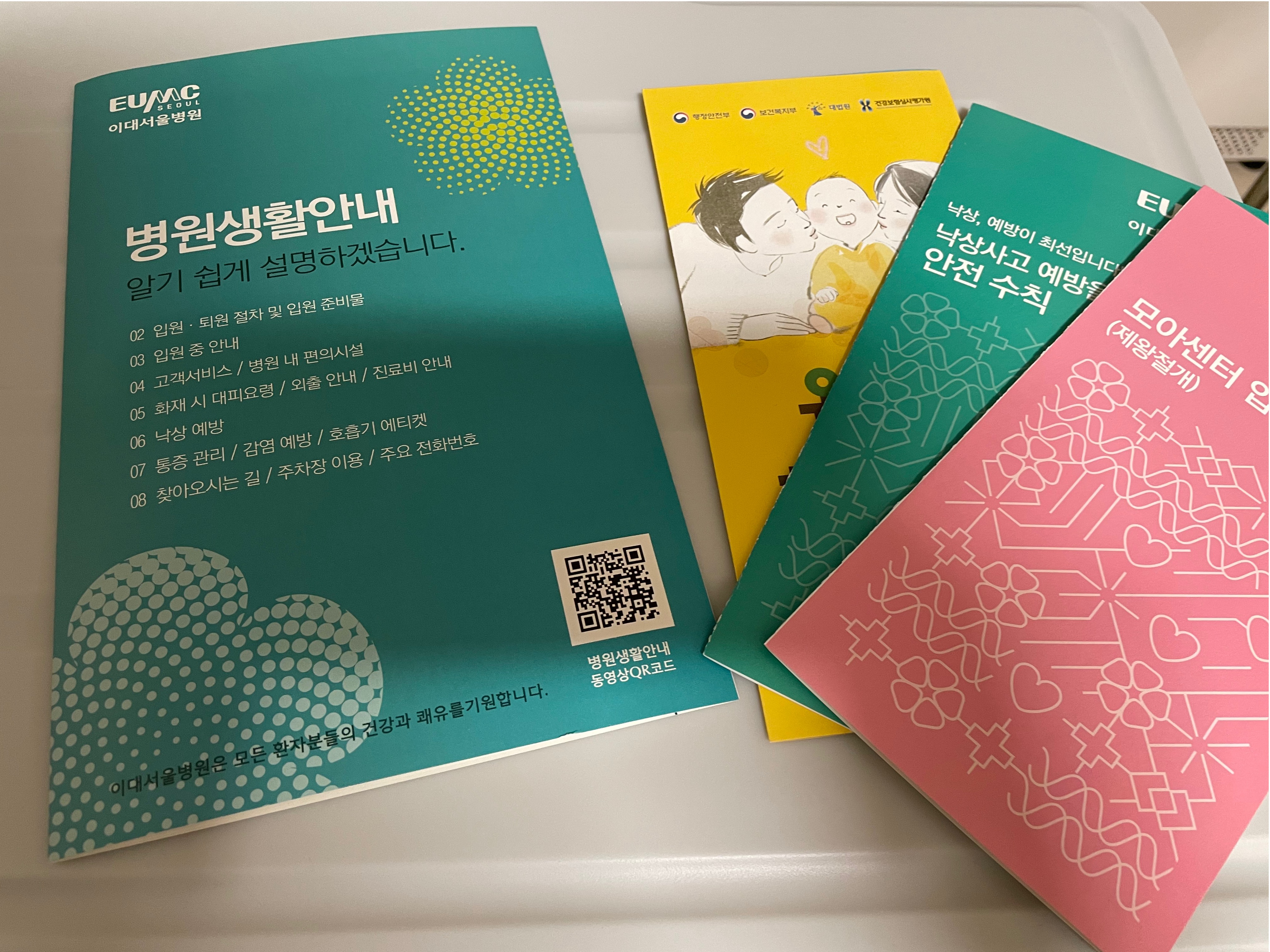 병원 안내문하고 제왕절개 관련 내용을 담은 책자입니다. 한번씩 읽어보시면 됩니다. 또 이때는 모아센터 출입카드를 한개를 주셔서 모아센터를 출입할때 사용하시면 됩니다.