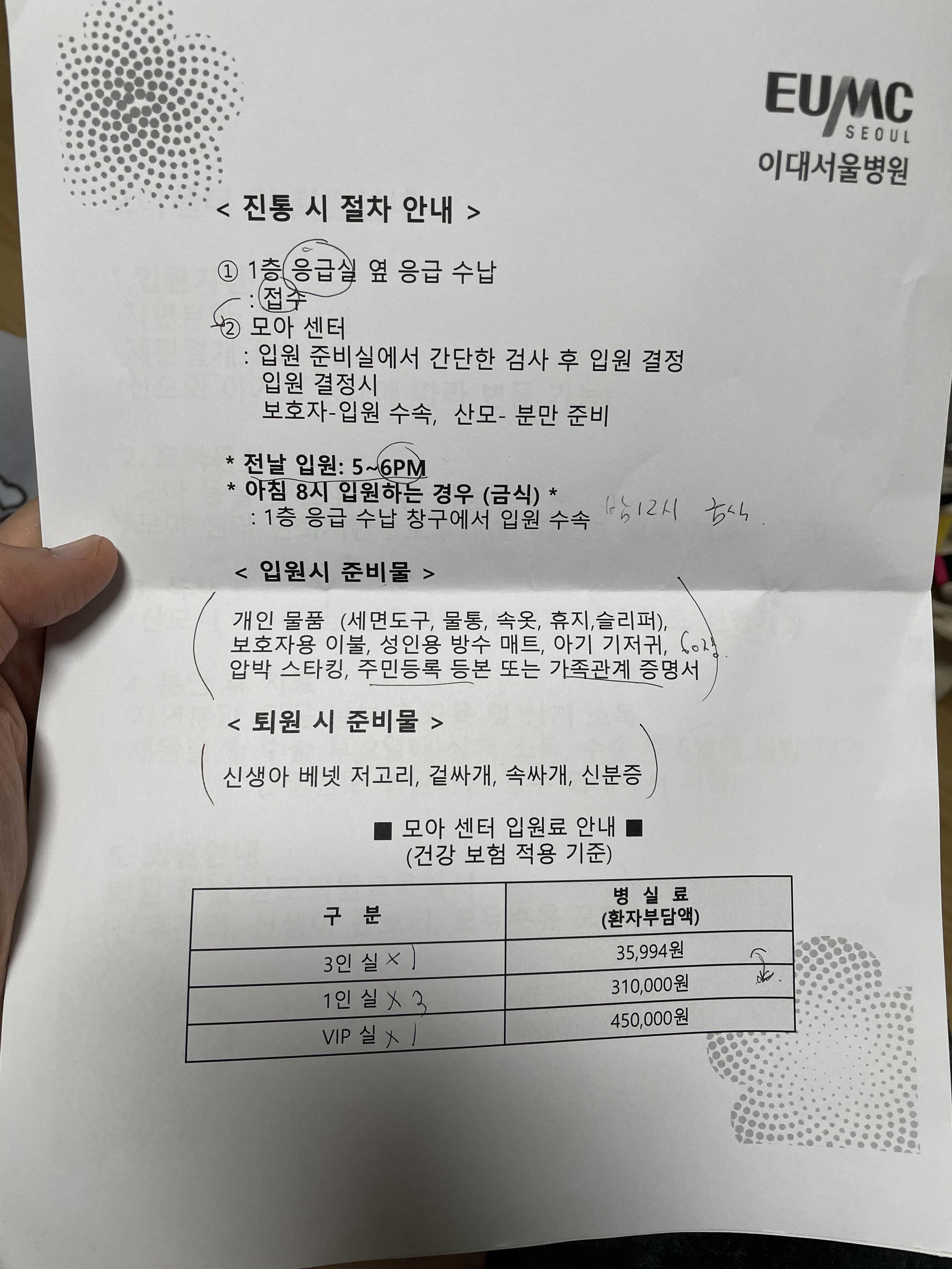 이번에 아이 출산을 위해서 제왕절개를 하려고 이대서울병원에 하루전 입원했습니다.