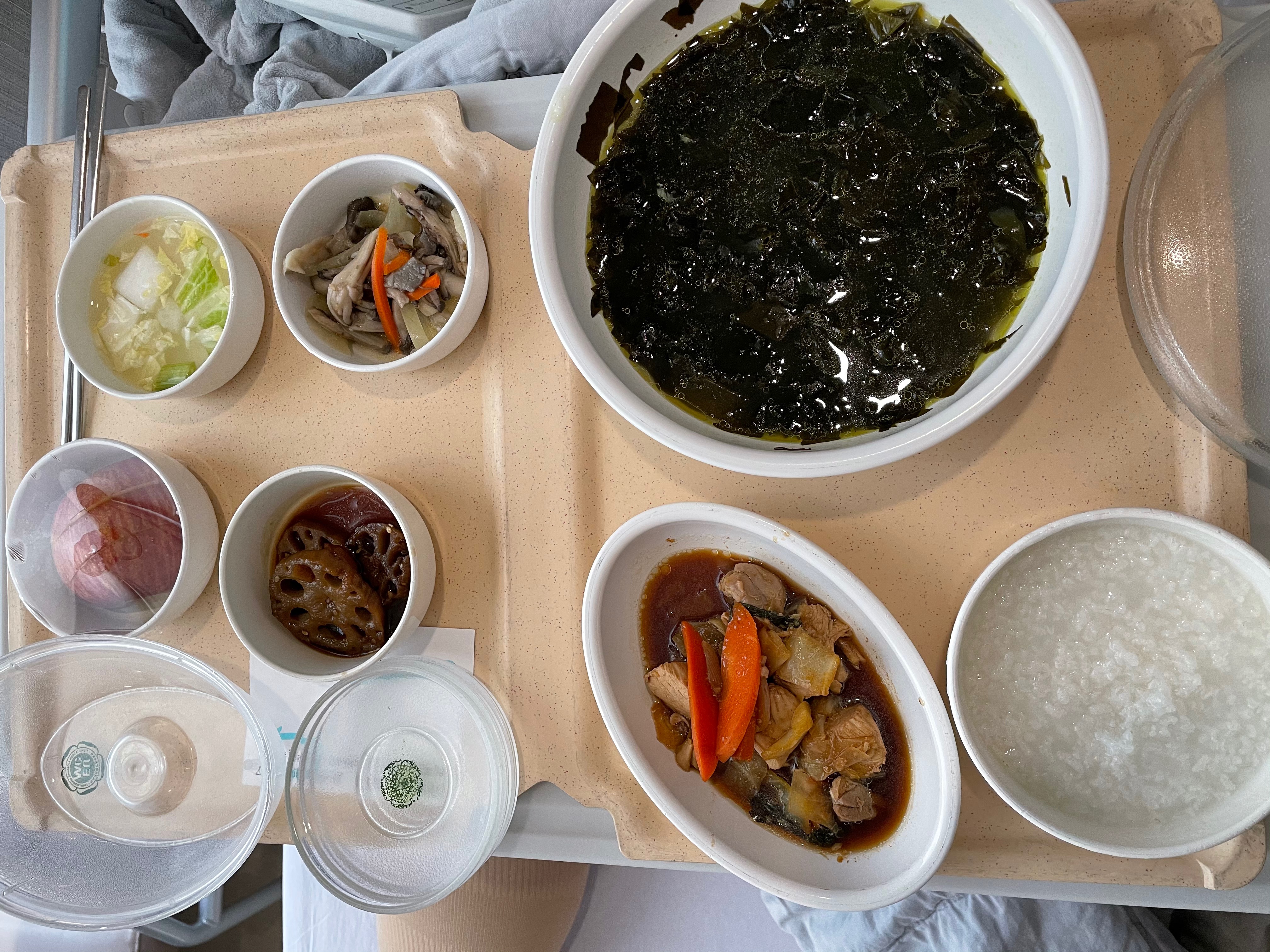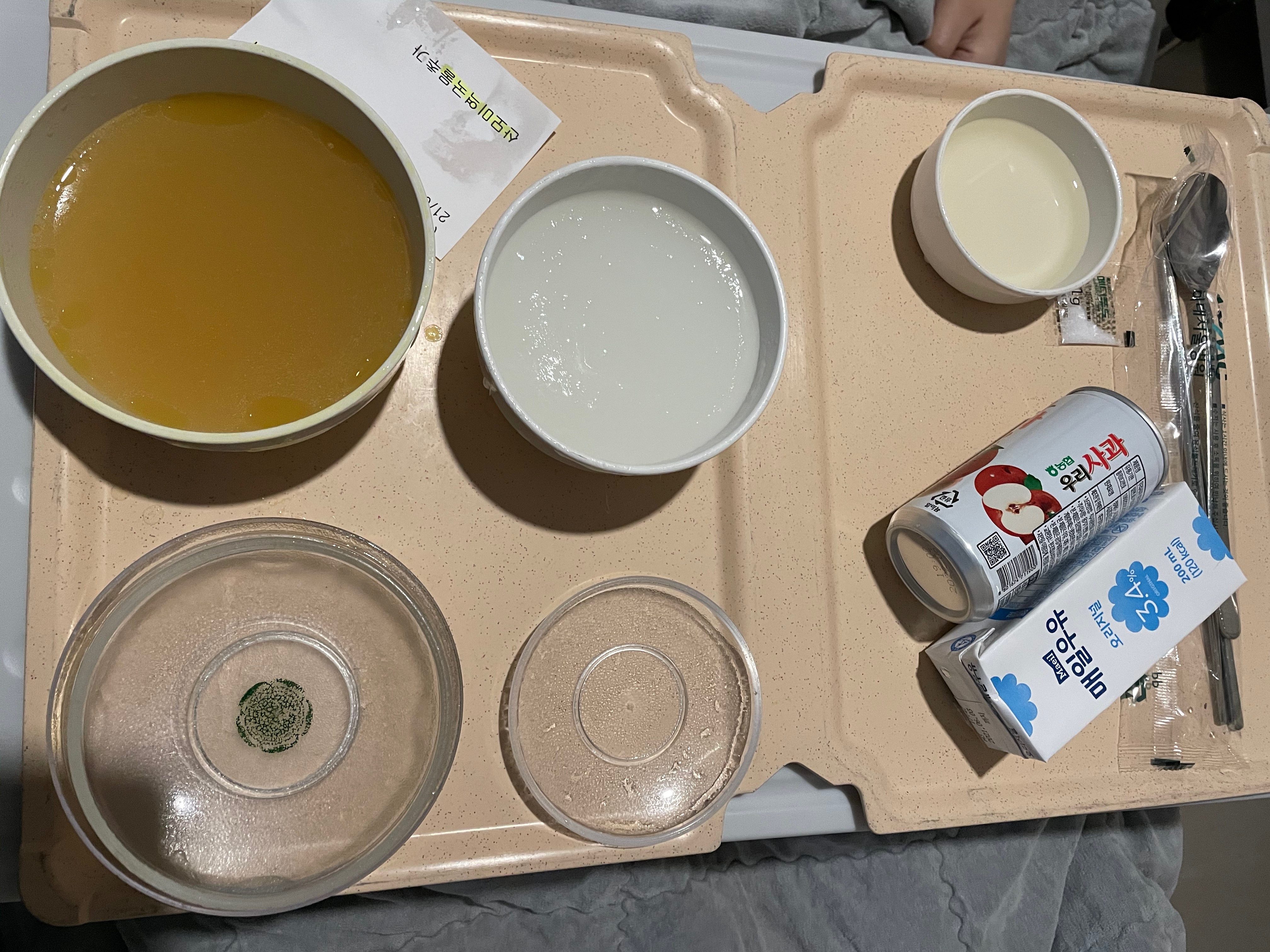 아침은 6:30 분 넘으면 나왔는데 저희는 수술 당일 저녁 9시 30분 부터 물 마셔도 된다고 하셔서 물 조금씩 마시기 시작했고 수술 다음날 아침식사는 미음으로 먹었습니다.