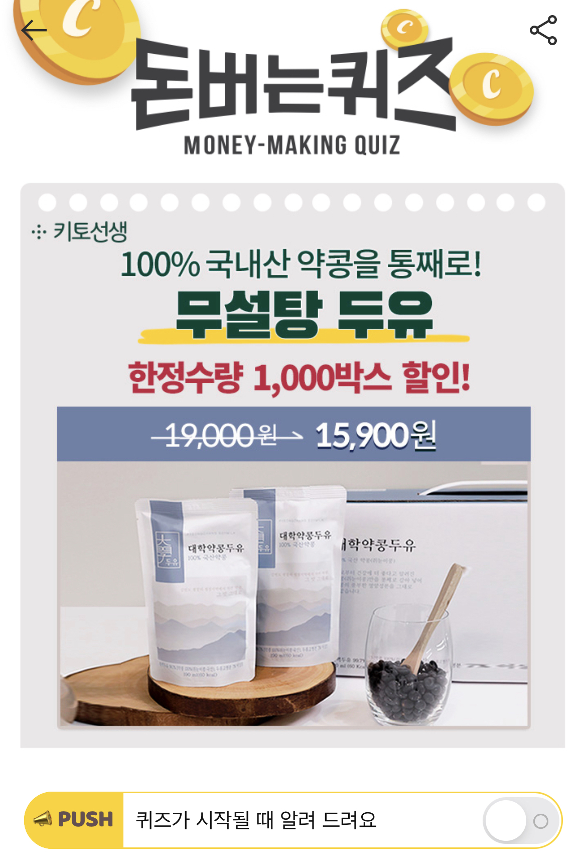 캐시워크 돈버는 퀴즈 정답 키토선생 대학약콩두유 순탄수화물 함량