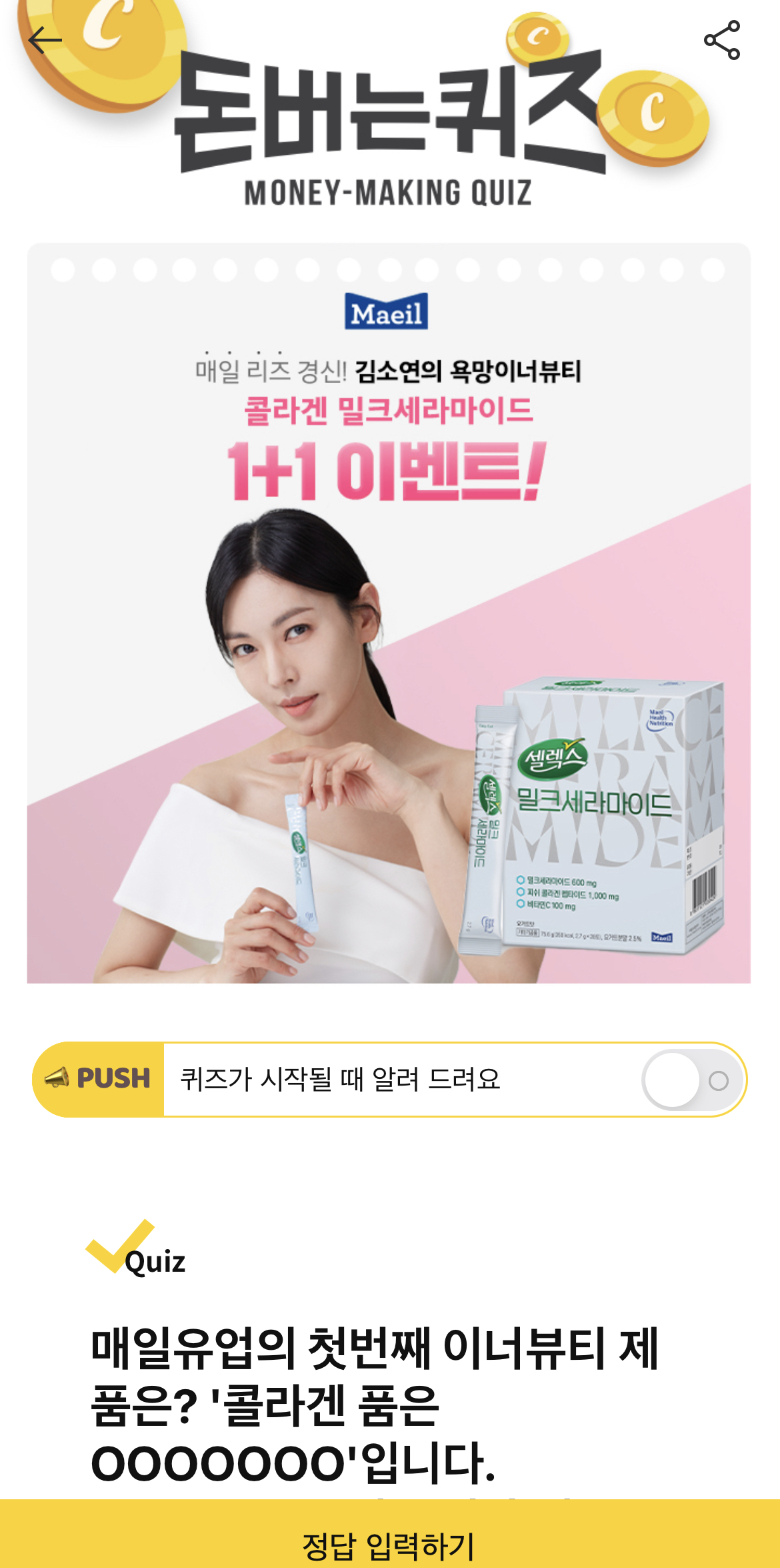캐시워크 돈버는 퀴즈 정답 매일유업 김소연 밀크세라마이드