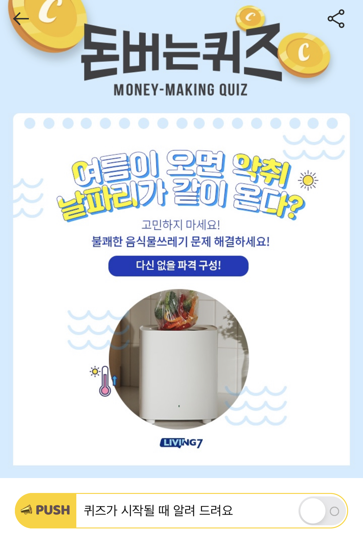 캐시워크 돈버는 퀴즈 정답 리빙7 음쓰쿨장고