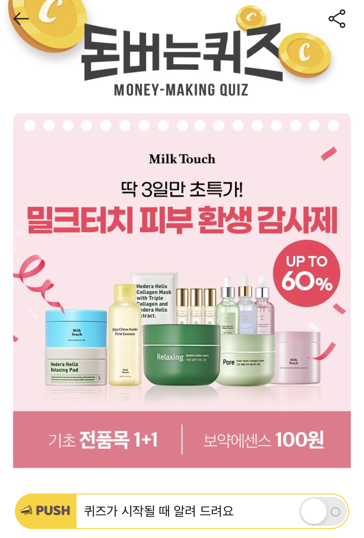캐시워크 돈버는 퀴즈 정답 밀크터치 63%