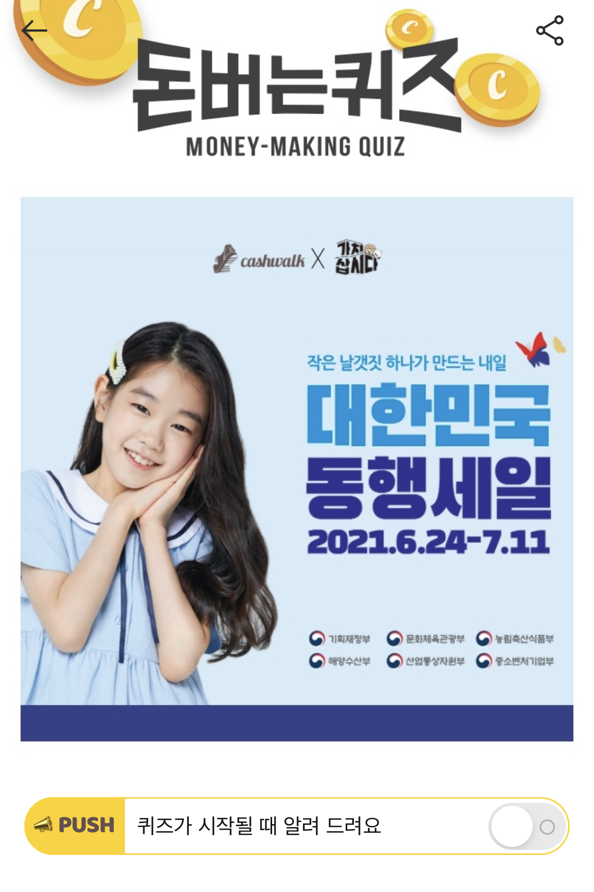 캐시워크 돈버는 퀴즈 정답 대한민국 동행세일 작은 날갯짓 하나가 만드는 내일