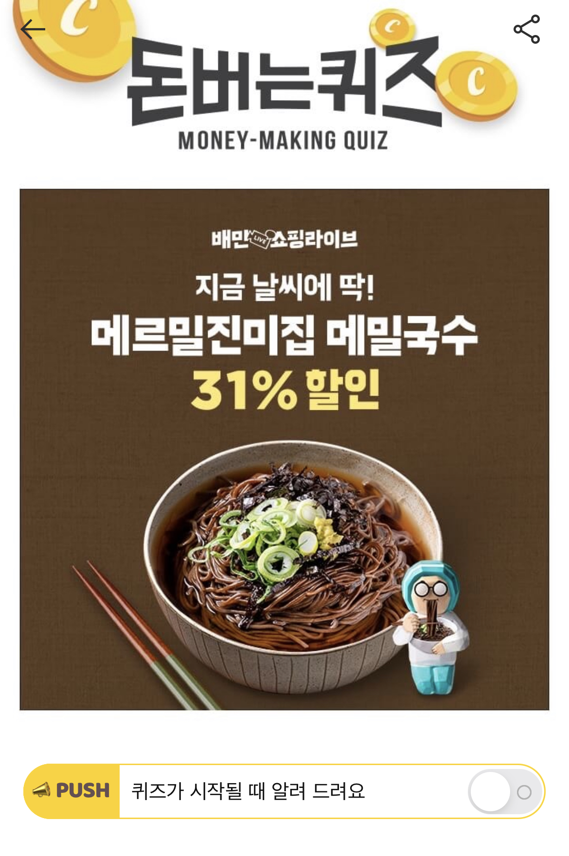 캐시워크 돈버는 퀴즈 정답 배민쇼핑라이브 메밀국수 맛집