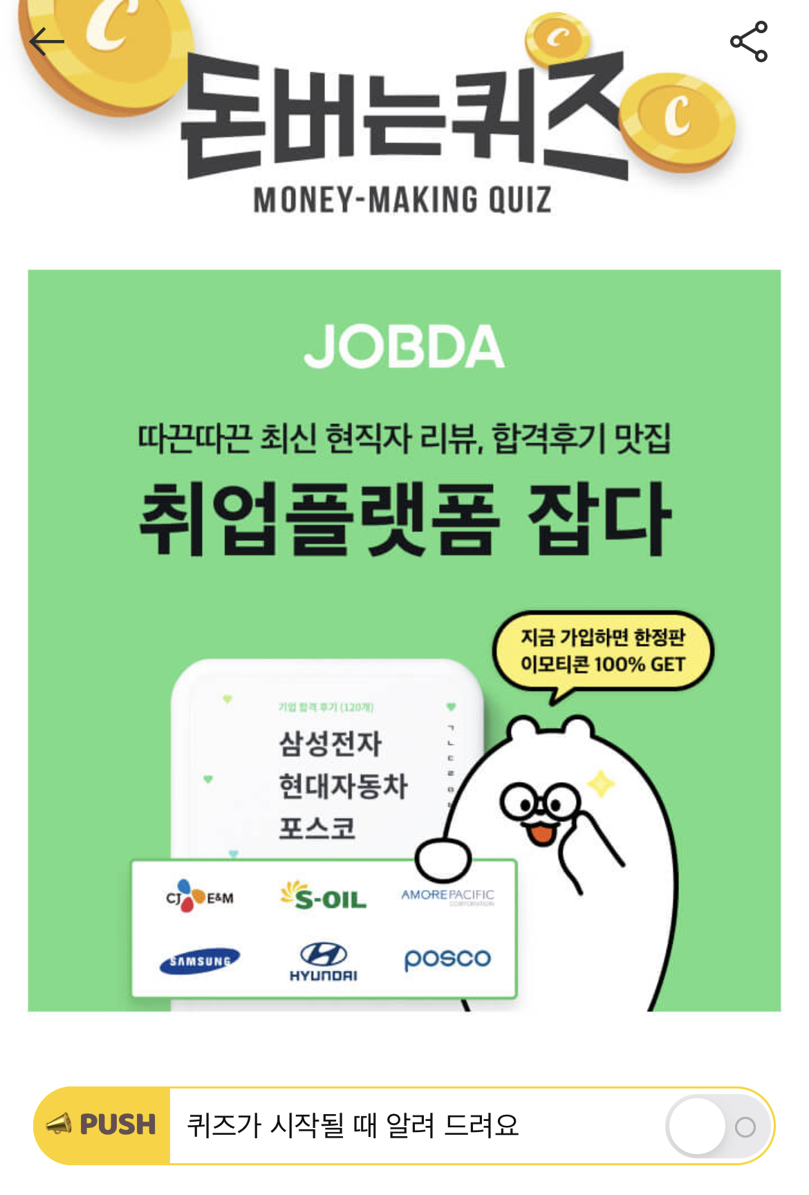 잡다는 가입만 하면, 10만 현직자리뷰, 최신면접후기, AI역량검사 공식 컨텐츠를 볼 수 있는 취업플랫폼입니다. 잡다 오픈기념으로, "가입만 해도 이모티콘, 추천하면 OO까지 잡다가 다 쏜다" 이벤트를 진행하고 있습니다. 여기서 OO에 들어갈 말은 무엇일까요?