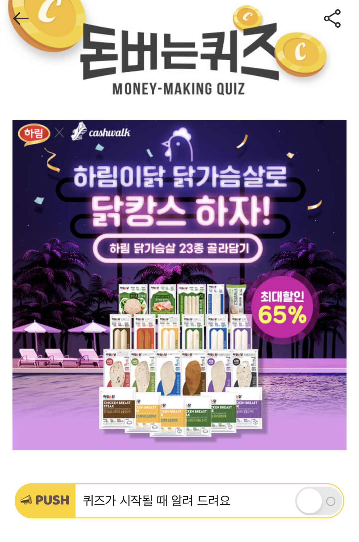 캐시워크 돈버는 퀴즈 정답 하림이닭 ㄷㅂㅈ