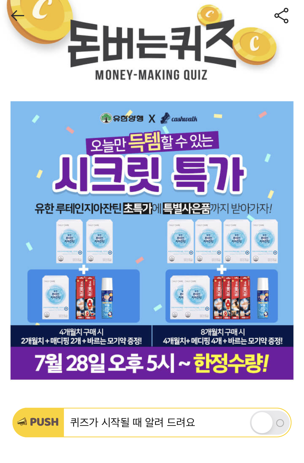 유한 루테인지아잔친 7월 28일 캐시워크 돈버는 퀴즈 정답 ㅊㅇㅈㄴ