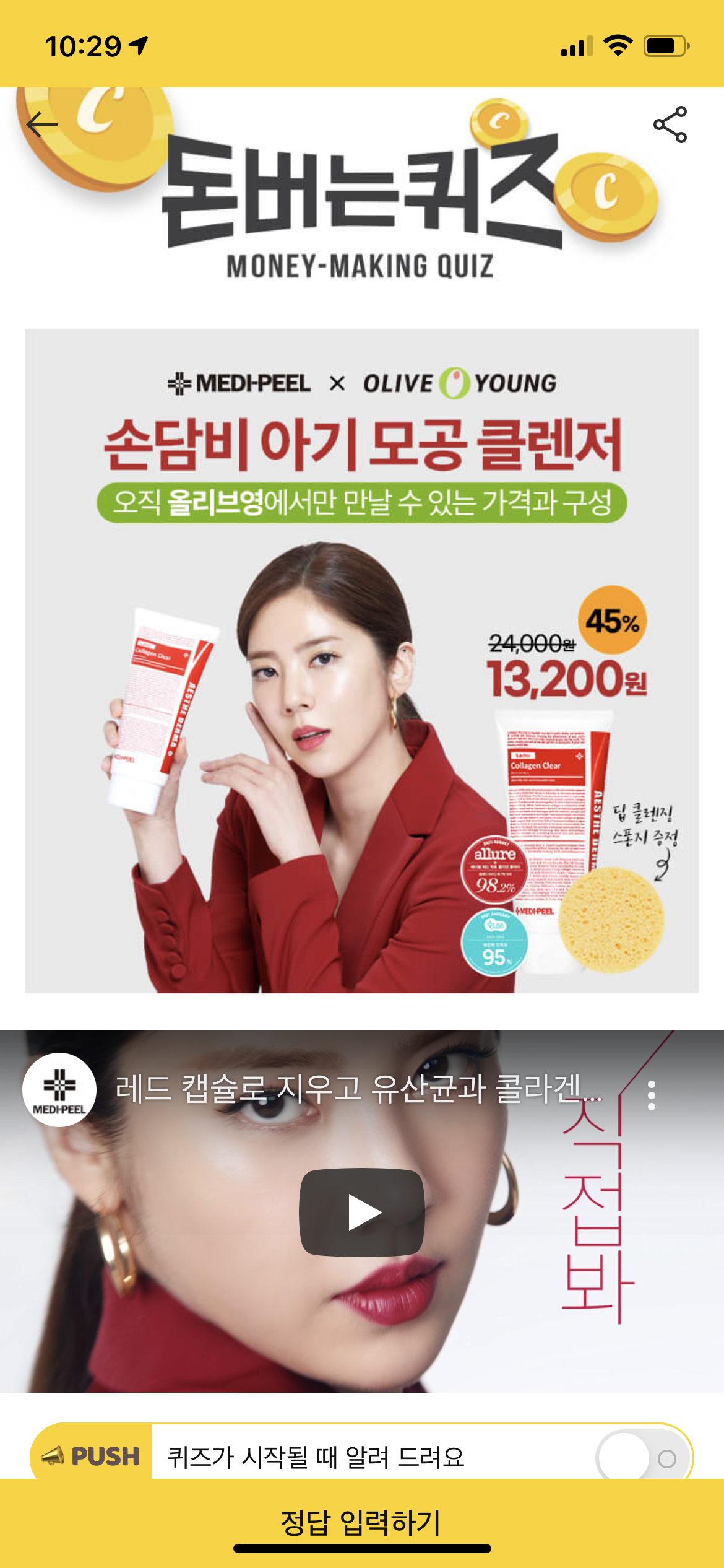 캐시워크 돈버는 퀴즈 정답 손담비 폼클렌징 레드 락토 콜라겐 클리어 ㄹㄷ