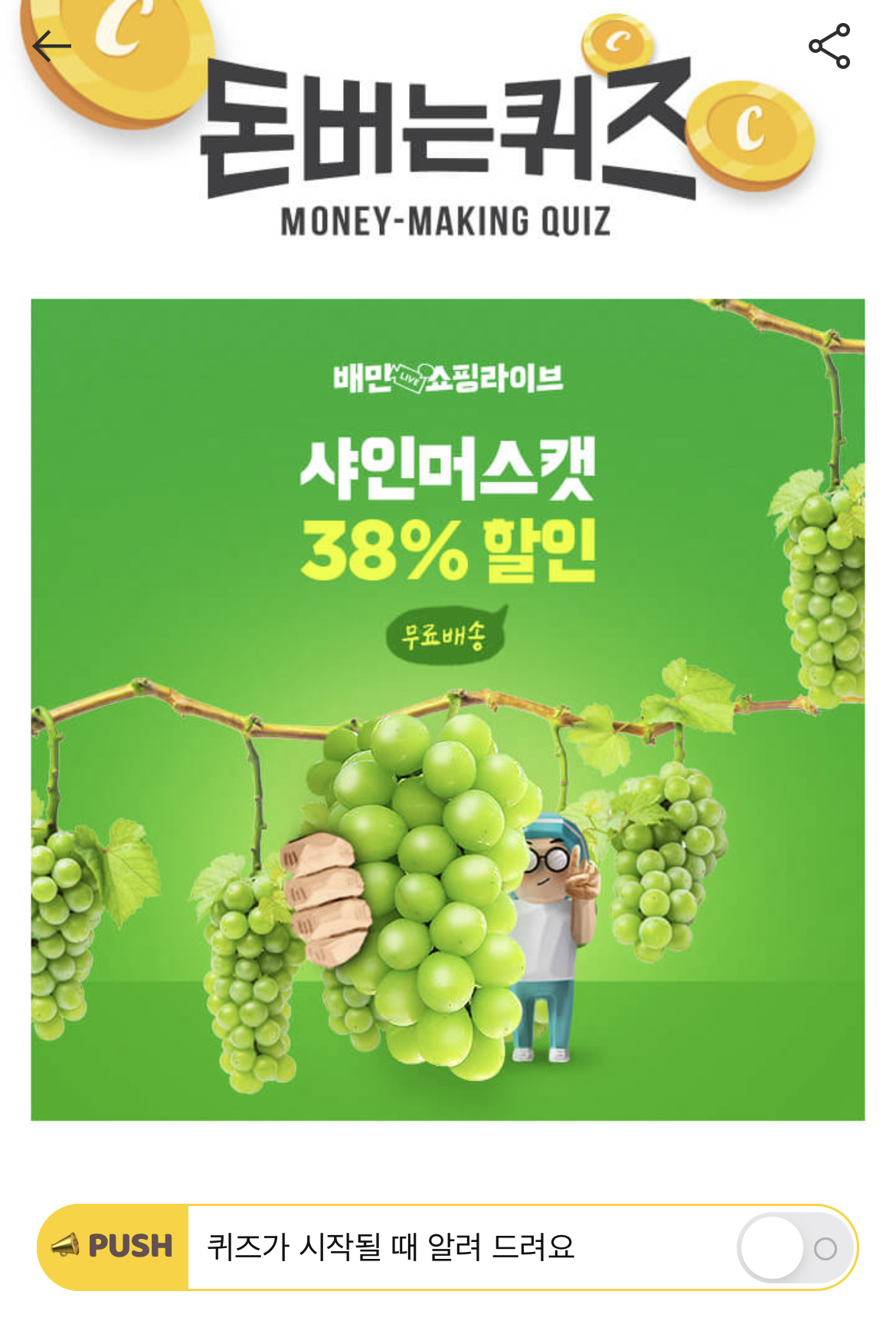 캐시워크 돈버는 퀴즈 정답 배민쇼핑라이브 샤인머스캣