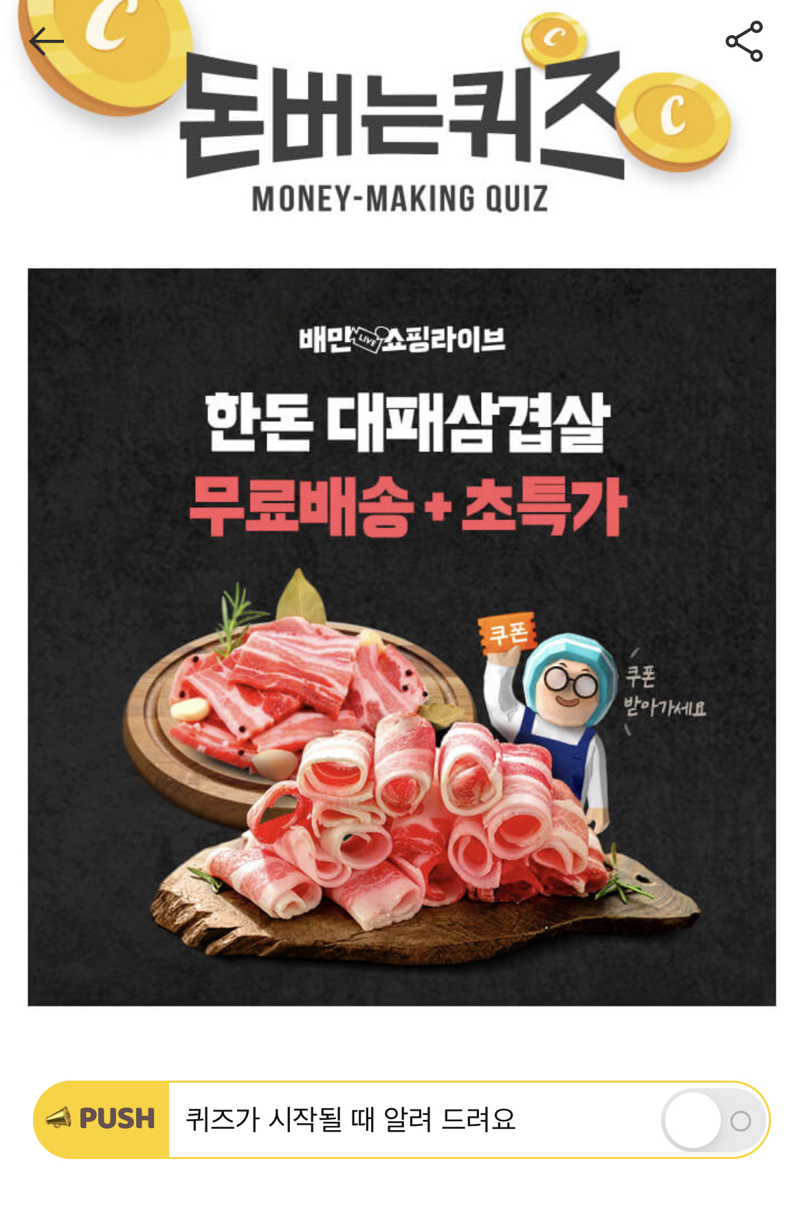 오늘 배민쇼핑라이브에서는 추억의 한돈 대패삼겹살 4인분을 OOO대 에 판매합니다! OOO에 들어갈 말은 무엇일까요?