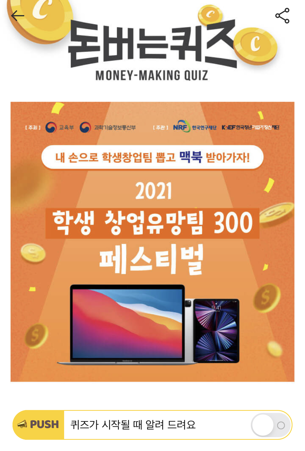 캐시워크 돈버는 퀴즈 정답 학생 창업유망팀 이벤트 ㅂㅁㄹㅈㅅ