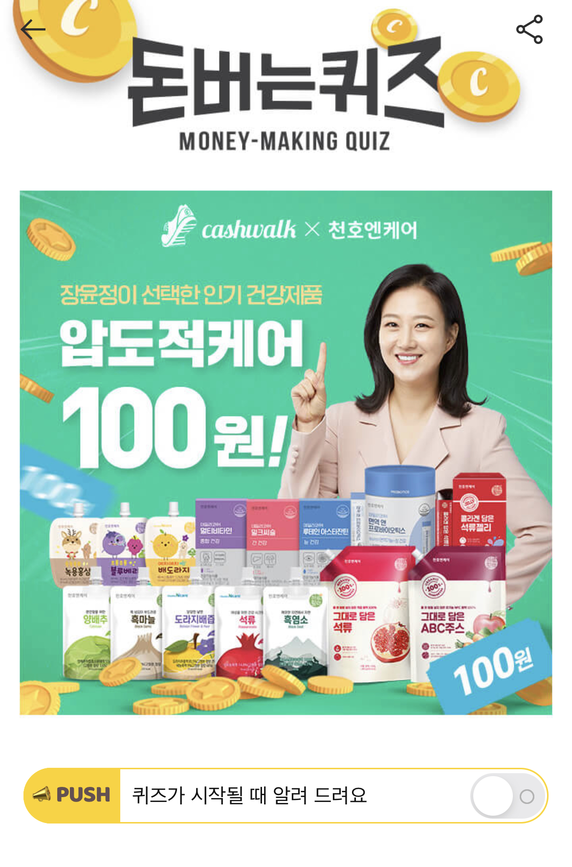 캐시워크 돈버는 퀴즈 정답 천호엔케어 장윤정 7자