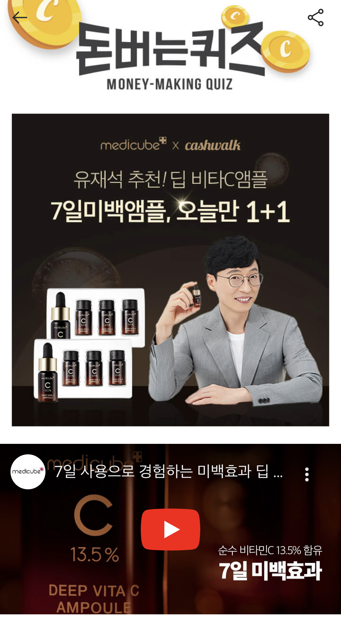 캐시워크 돈버는 퀴즈 정답 메디큐브 7일미백앰플 딥비타C앰플 ㅇㅊㅈㅇㅅㅎ