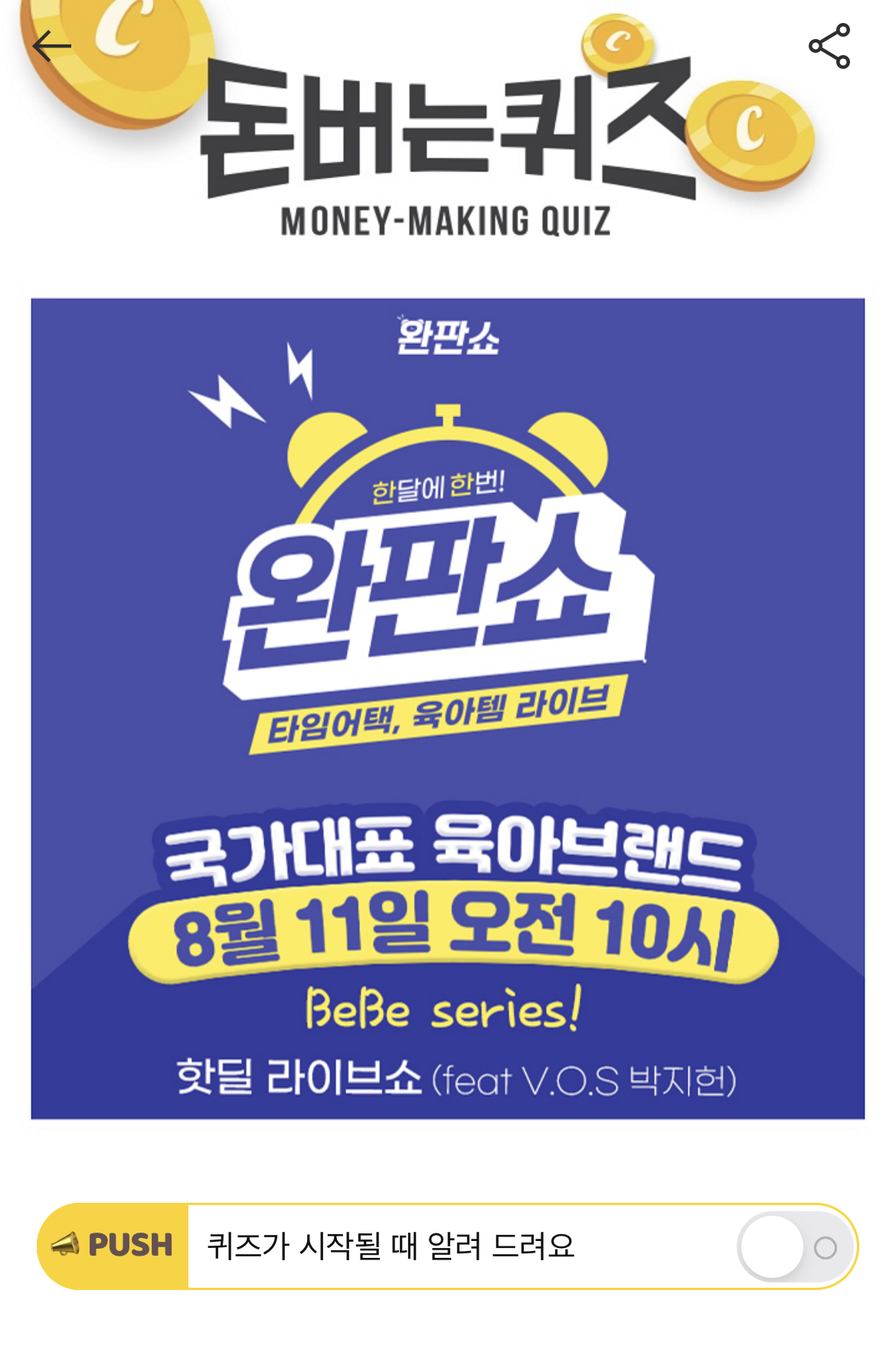 캐시워크 돈버는 퀴즈 정답 육아템 라이브 완판쇼