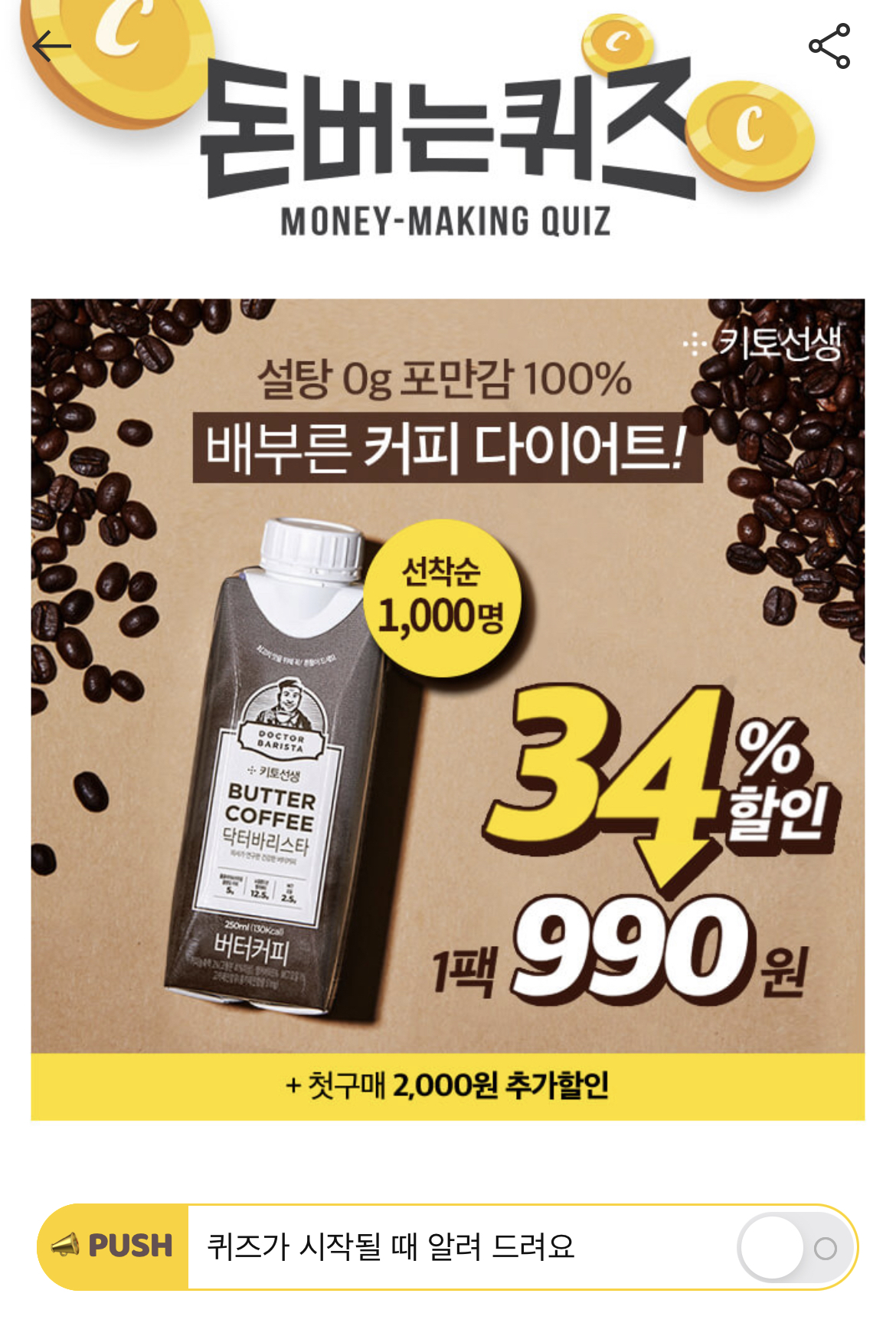 캐시워크 돈버는퀴즈 정답 키토선생 닥터바리스타 버터커피 박스