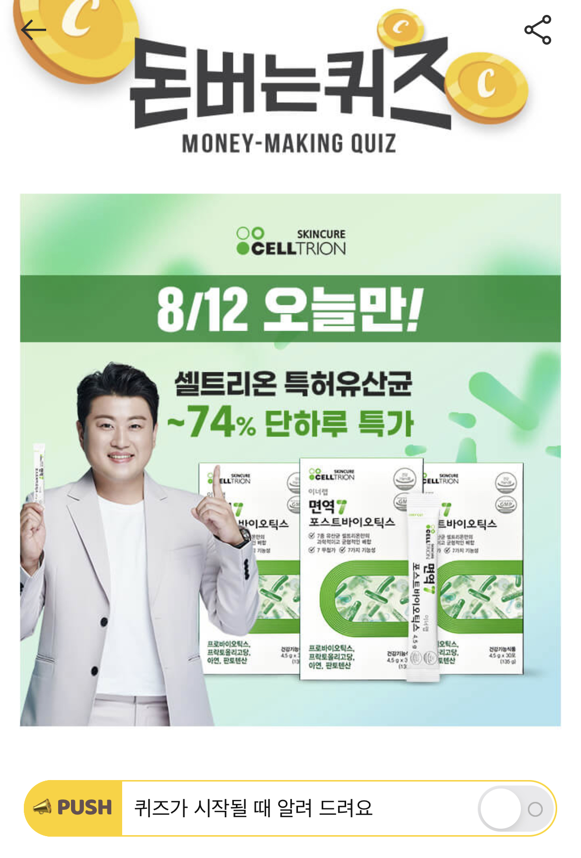 캐시워크 돈버는퀴즈 정답 셀트리온 면역7 포스트바이오틱스 ㅂㅊ