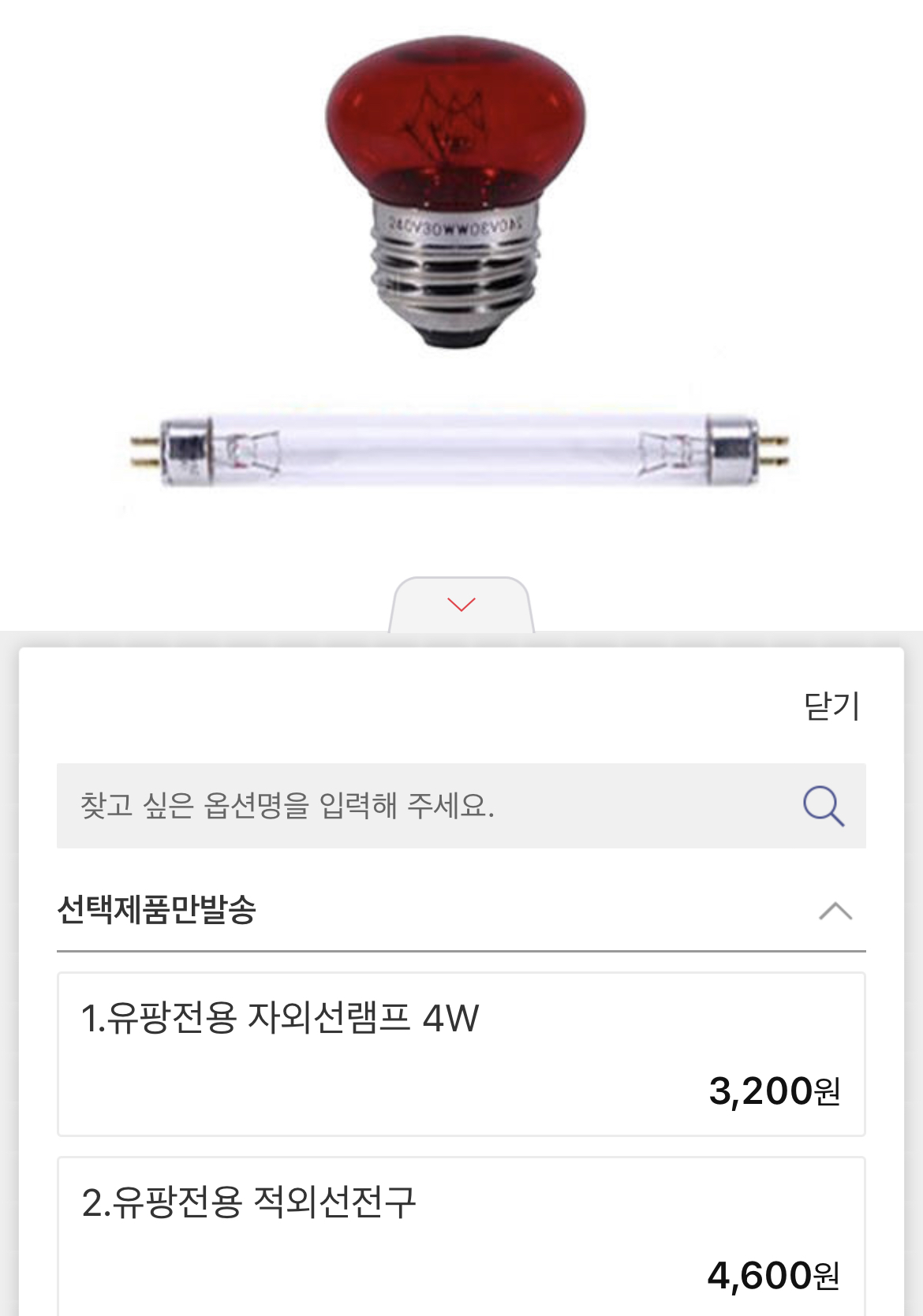 길다란 자외선 램프랑 빨간 적외선 전구를 배송비해서 만원 이 좀 넘는 가격에 구매해서 교체 했어요.