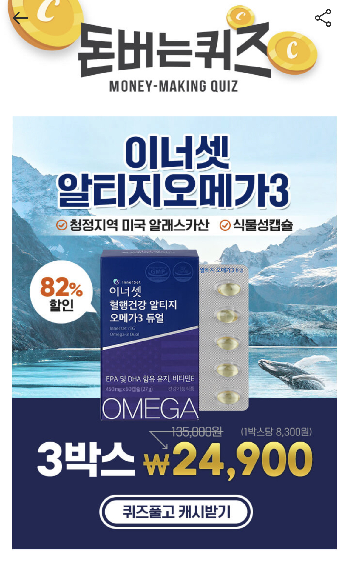 캐시워크 돈버는 퀴즈 정답 이너셋 알티지오메가3 ㅇㄹㅅㅋㅂㄹㅎㅎ
