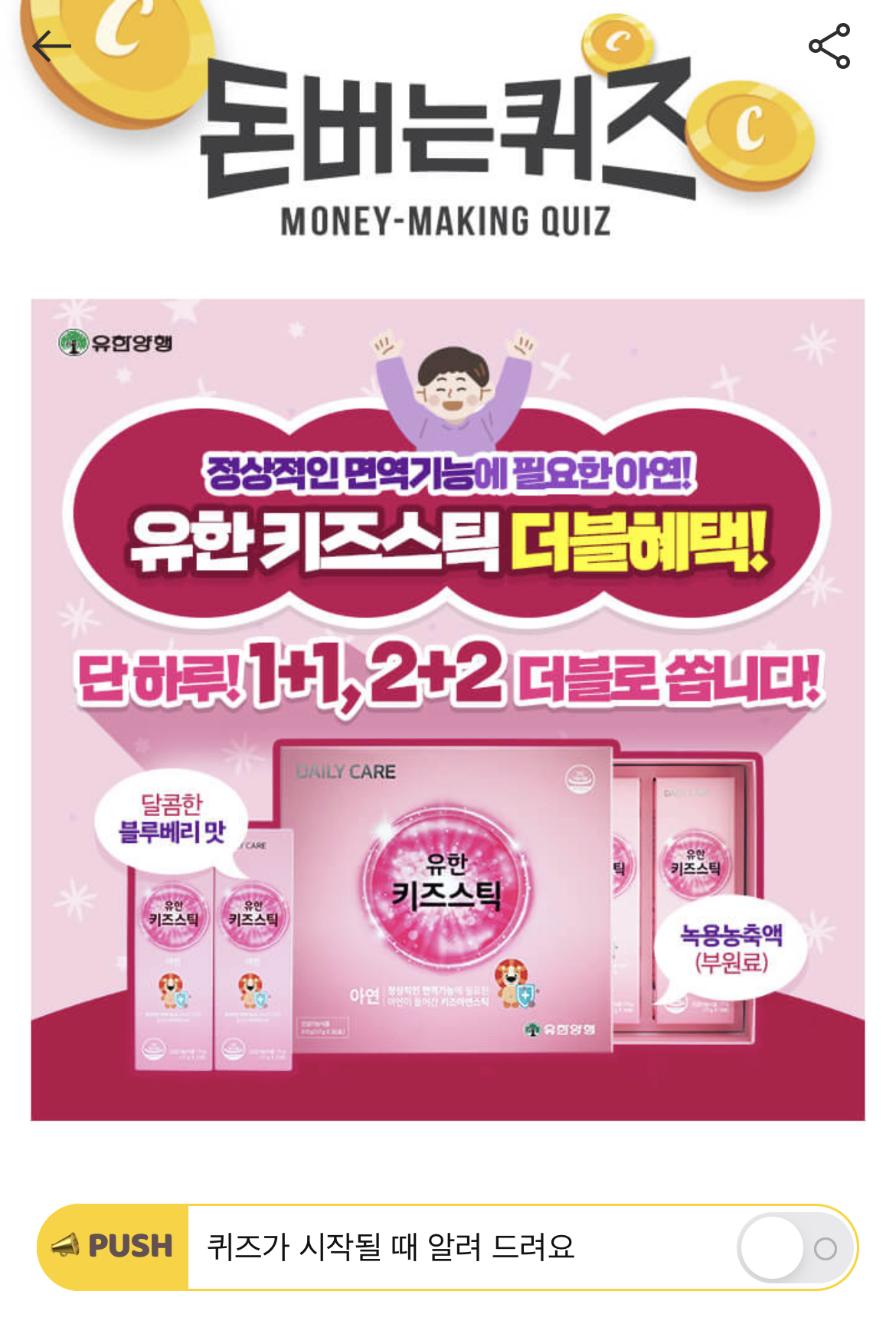 캐시워크 돈버는 퀴즈 정답 유한 키즈스틱 자연스런 맛