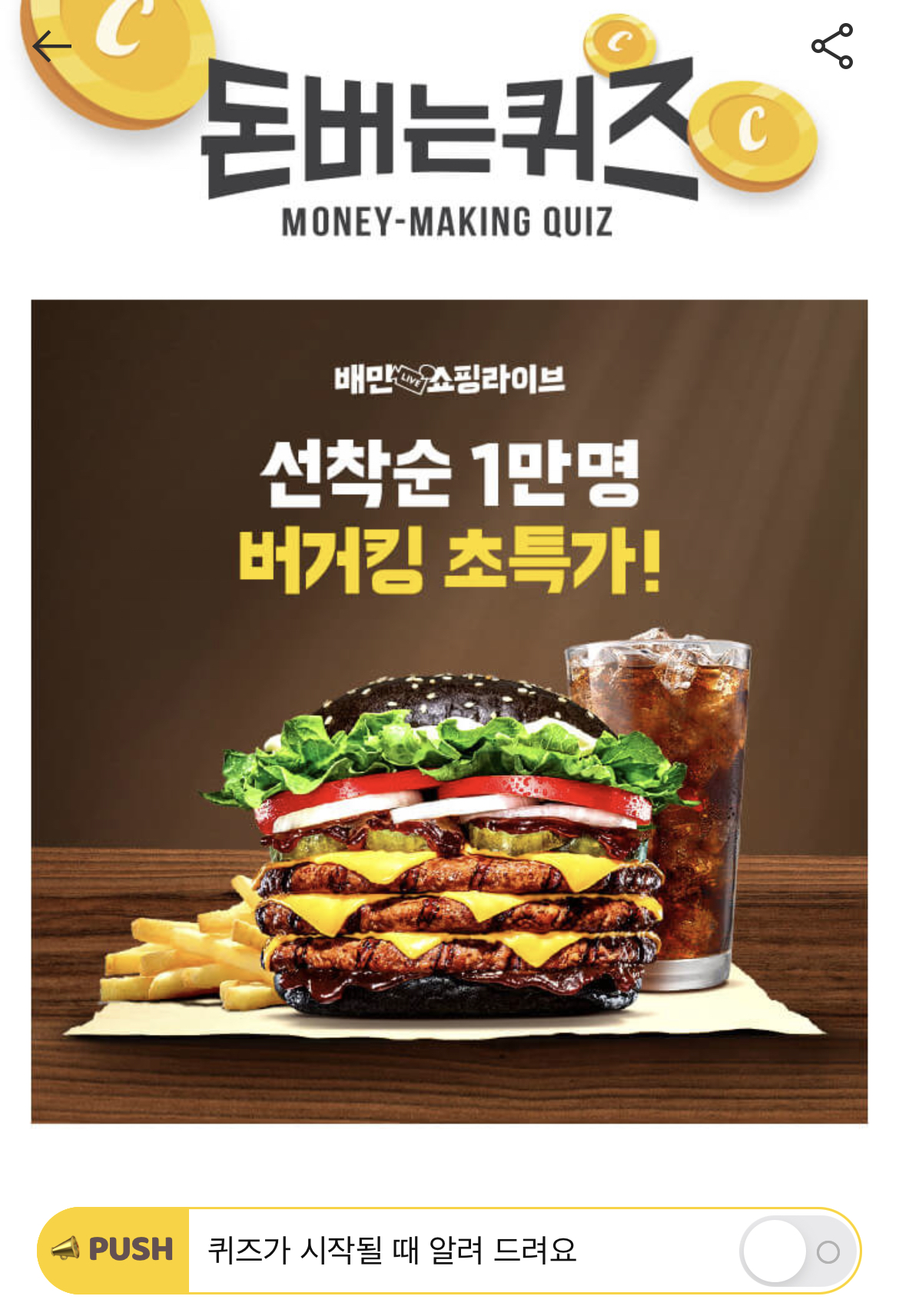 오늘! 배민쇼핑라이브에서는 선착순 1만명에게 버거킹 상품권 총 O천원 혜택을 드립니다! O에 들어갈 숫자는 무엇일까요?
