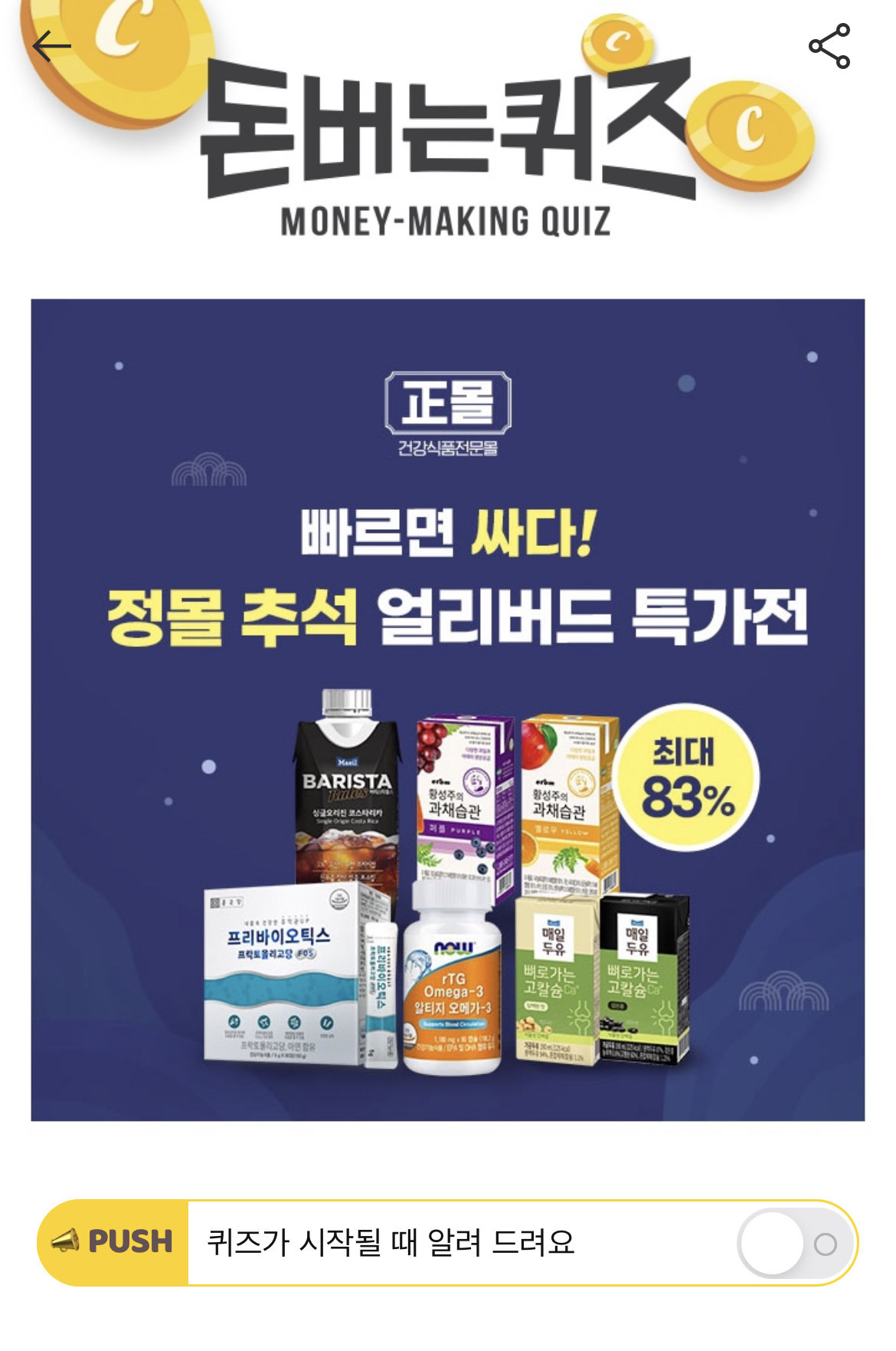 캐시워크 돈버는 퀴즈 정답 정몰 추석 얼리버드 특가전