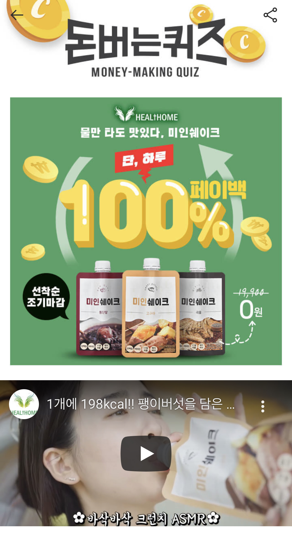 캐시워크 돈버는 퀴즈 정답 미인쉐이크 곡물맛 단백질 함량