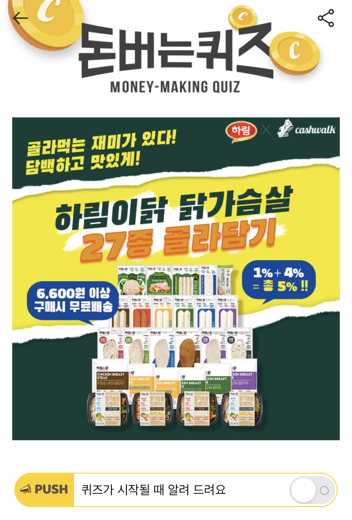 캐시워크 돈버는 퀴즈 정답 하림이닭 닭가슴살 ㅅㅅㅎㅇㅊ