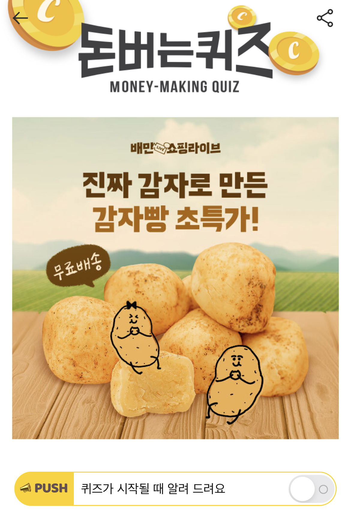 캐시워크 돈버는 퀴즈 정답 배민쇼핑라이브 감자빵